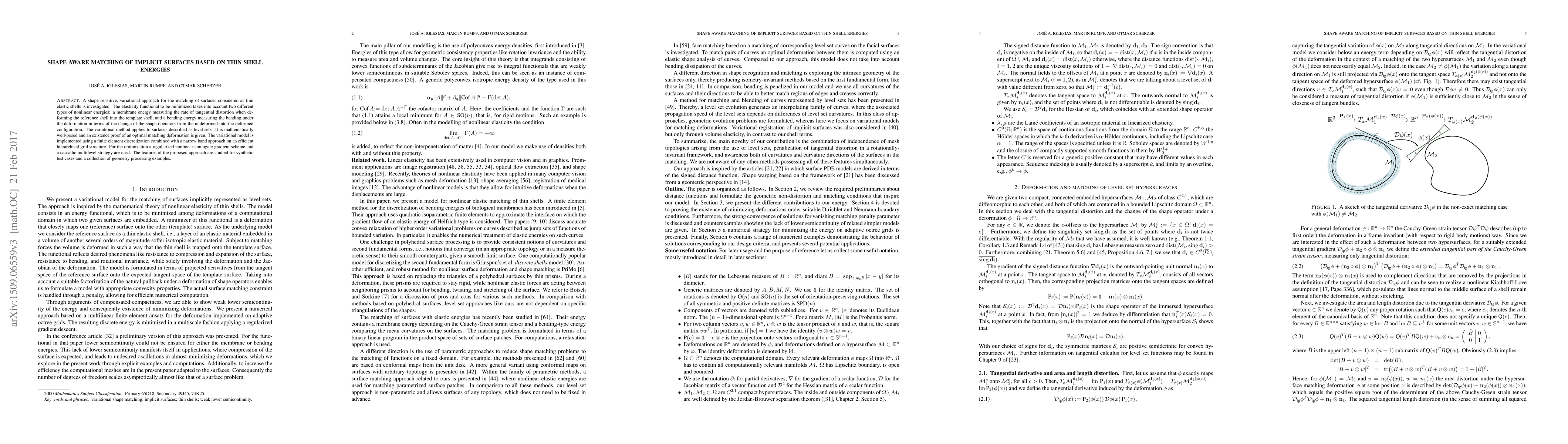 This paper proposes a variational method for matching implicit surfaces treated as thin elastic shells, incorporating membrane and bending energies to account for tangential distortion and bending during deformation. The method is mathematically sound, implemented via finite element discretization, and tested on synthetic and real geometry processing examples.
