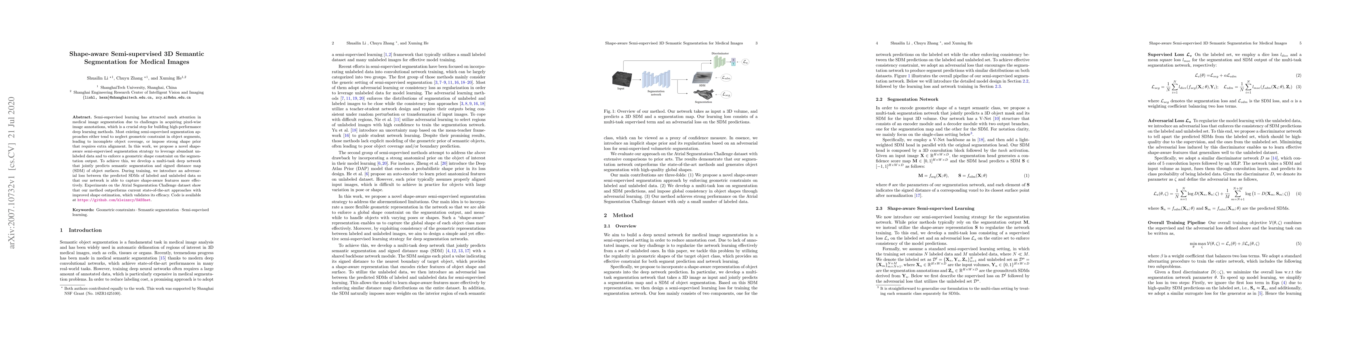 This paper proposes a shape-aware semi-supervised 3D semantic segmentation method for medical images that leverages unlabeled data and enforces geometric constraints through a multi-task deep network predicting both segmentation and signed distance maps. The method outperforms current state-of-the-art approaches in the Atrial Segmentation Challenge dataset.
