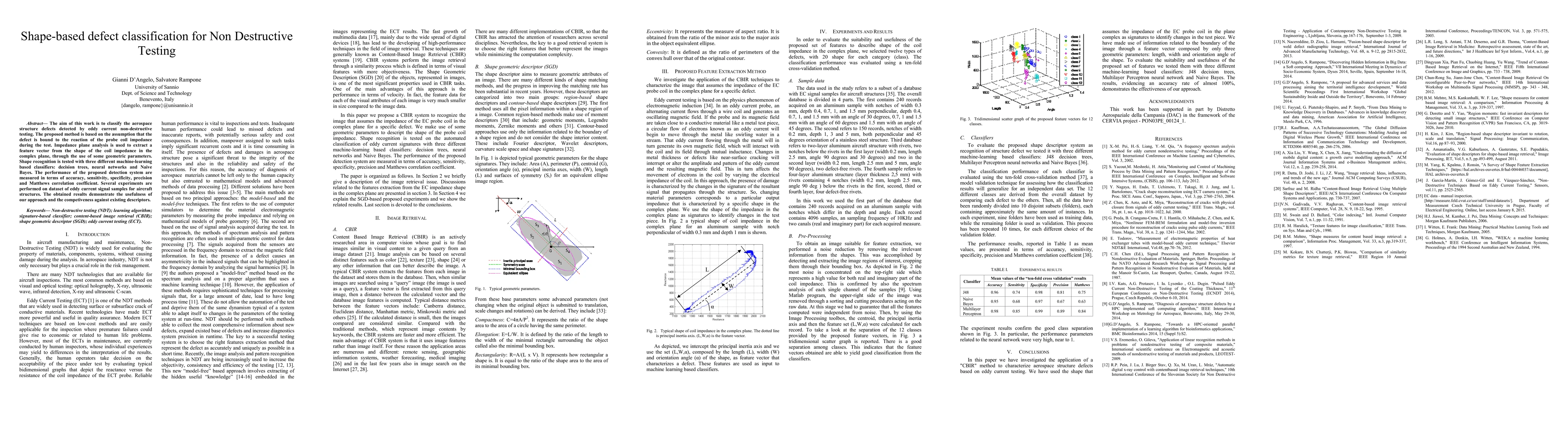 This paper proposes a method for classifying aerospace structure defects using eddy current non-destructive testing, employing impedance plane analysis and shape-based features. It tests the approach with decision trees, neural networks, and Naive Bayes classifiers, demonstrating competitive performance in defect classification.