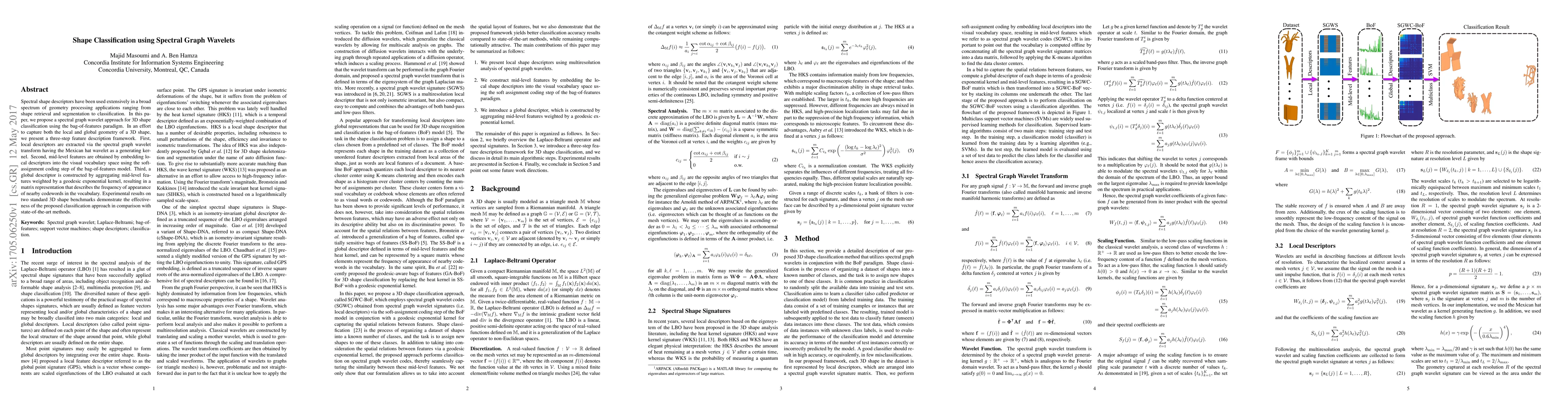 This paper proposes a spectral graph wavelet approach for 3D shape classification using the bag-of-features paradigm, combining local and global geometry descriptors through a three-step framework, and demonstrating superior performance on standard benchmarks compared to state-of-the-art methods.