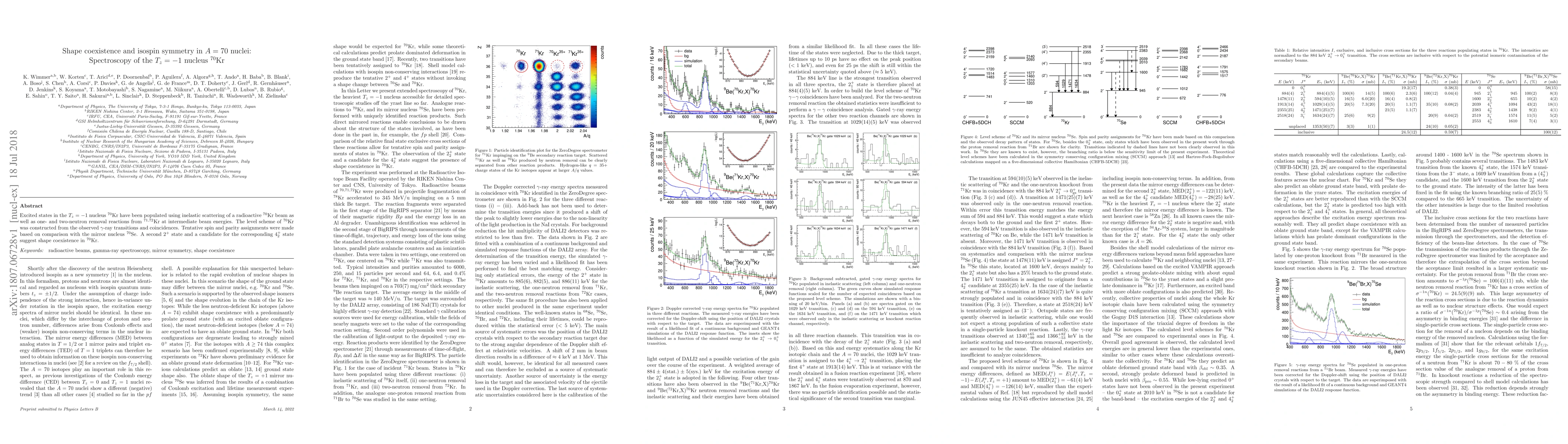 Excited states in the $T_z=-1$ nucleus $^{70}$Kr have been populated using inelastic scattering of a radioactive $^{70}$Kr beam as well as one- and two-neutron removal reactions from $^{71,72}$Kr at intermediate beam energies. The level scheme of $^{70}$Kr was constructed from the observed $\gamma$-ray transitions and coincidences. Tentative spin and parity assignments were made based on comparison with the mirror nucleus $^{70}$Se. A second $2^+$ state and a candidate for the corresponding $4^+_2$ state suggest shape coexistence in $^{70}$Kr.