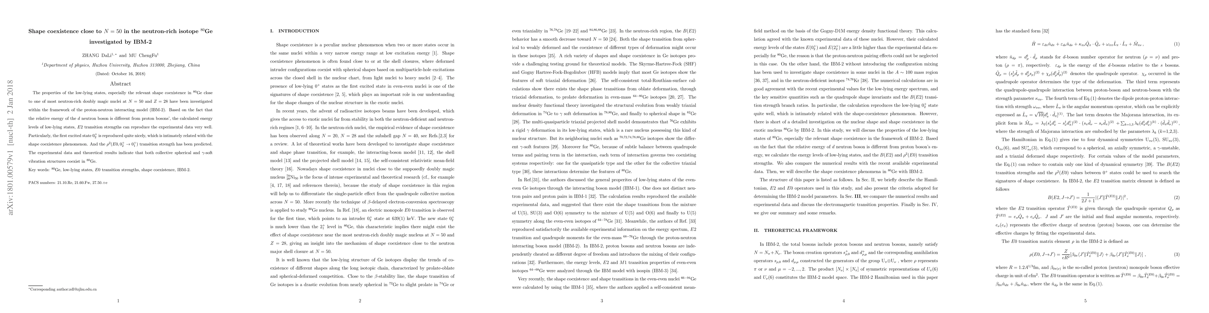 The properties of the low-lying states, especially the relevant shape coexistence in $^{80}$Ge close to one of most neutron-rich doubly magic nuclei at $N=50$ and $Z=28$ have been investigated within the framework of the proton-neutron interacting model (IBM-2). Based on the fact that the relative energy of the $d$ neutron boson is different from proton bosons', the calculated energy levels of low-lying states, $E2$ transition strengths can reproduce the experimental data very well. Particularly, the first excited state 0$^+_2$ is reproduced quite nicely, which is intimately related with the shape coexistence phenomenon. And the $\rho^2(E0, 0^+_2\rightarrow0^+_1)$ transition strength has been predicted. The experimental data and theoretical results indicate that both collective spherical and $\gamma$-soft vibration structures coexist in $^{80}$Ge. Key words: $^{80}$Ge, low-lying states, $E0$ transition strengths, shape coexistence, IBM-2.