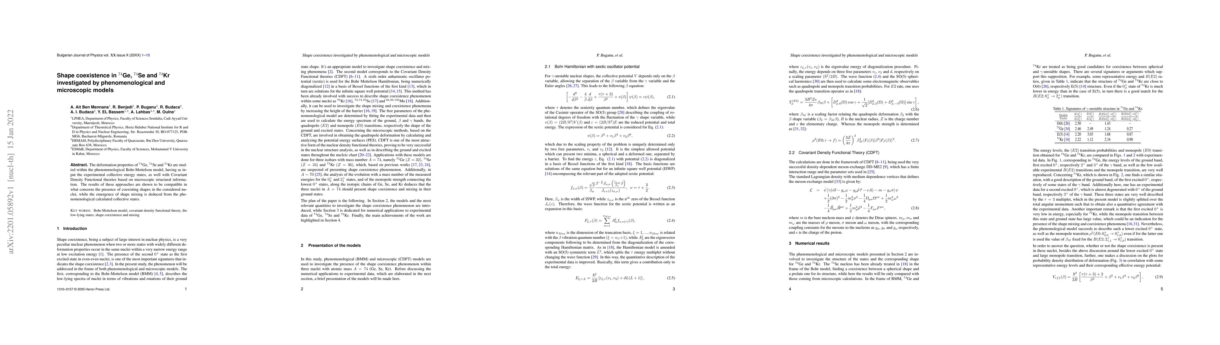 The deformation properties of 74Ge, 74Se and 74Kr are studied within the phenomenological Bohr-Mottelson model, having as input the experimental collective energy states, as well with Covariant Density Functional theories based on microscopic structural information. The results of these approaches are shown to be compatible in what concerns the presence of coexisting shapes in the considered nuclei, while the emergence of shape mixing is deduced from the phenomenological calculated collective states.