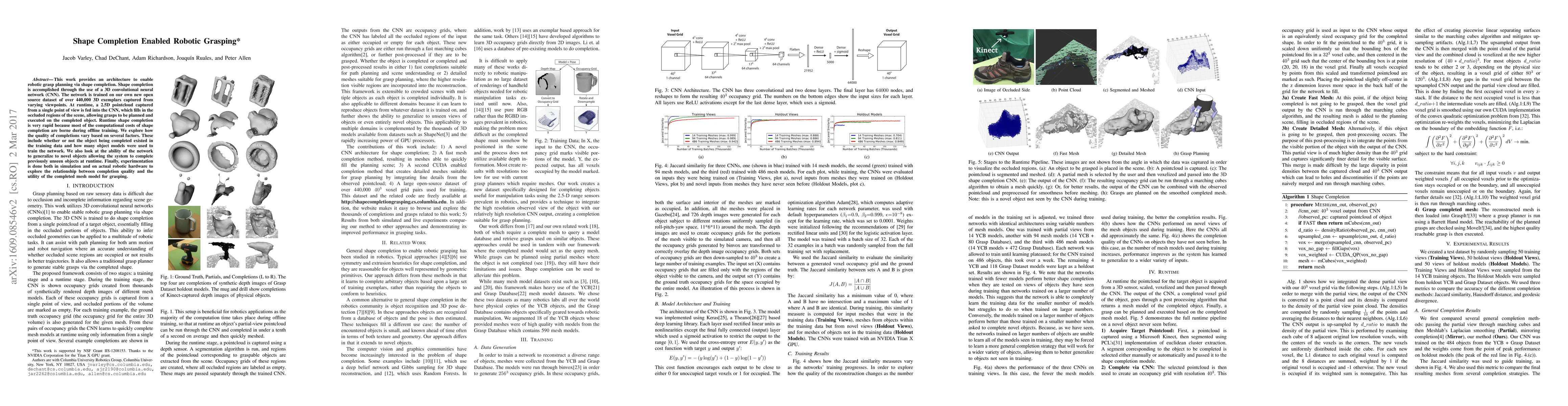 This paper presents a neural network architecture for robotic grasp planning through shape completion using a 3D CNN, trained on a large dataset, and demonstrates its effectiveness in both simulation and real-world robotic applications. The network rapidly completes occluded object regions from single viewpoint pointclouds, enabling successful grasp execution.