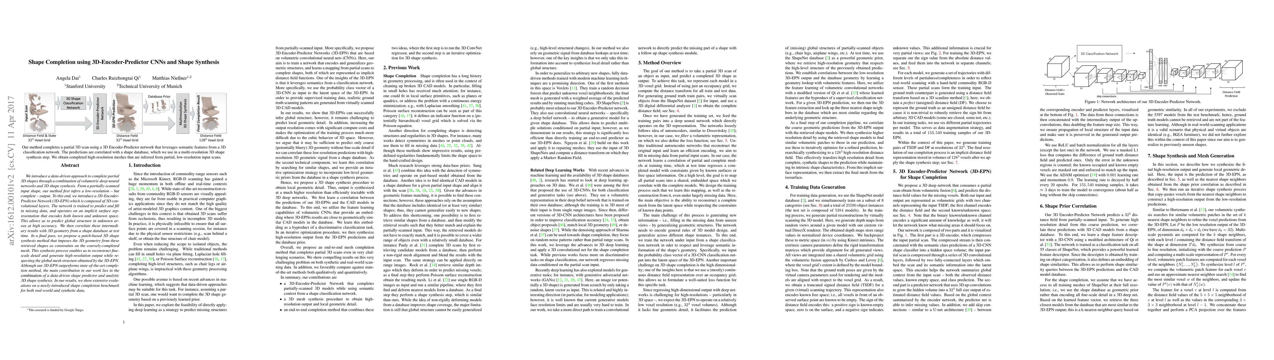 This research proposes a data-driven method for completing partial 3D shapes using a 3D-Encoder-Predictor Network (3D-EPN) to infer a complete low-resolution shape, followed by 3D shape synthesis to reconstruct fine-scale details while maintaining global structure. The method outperforms existing techniques and introduces a benchmark for evaluation.