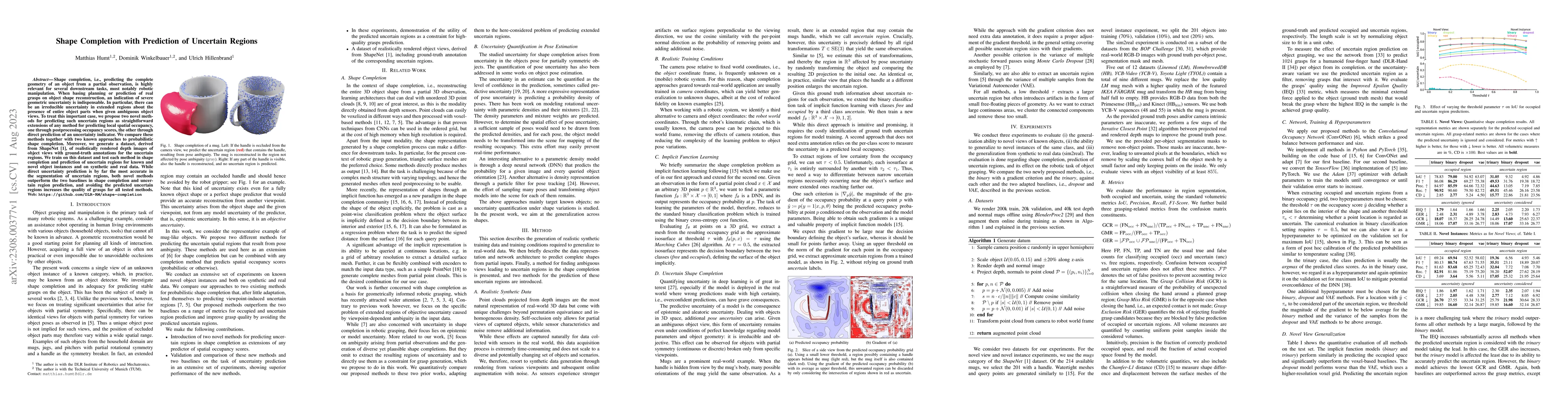 Shape completion, i.e., predicting the complete geometry of an object from a partial observation, is highly relevant for several downstream tasks, most notably robotic manipulation. When basing planning or prediction of real grasps on object shape reconstruction, an indication of severe geometric uncertainty is indispensable. In particular, there can be an irreducible uncertainty in extended regions about the presence of entire object parts when given ambiguous object views. To treat this important case, we propose two novel methods for predicting such uncertain regions as straightforward extensions of any method for predicting local spatial occupancy, one through postprocessing occupancy scores, the other through direct prediction of an uncertainty indicator. We compare these methods together with two known approaches to probabilistic shape completion. Moreover, we generate a dataset, derived from ShapeNet, of realistically rendered depth images of object views with ground-truth annotations for the uncertain regions. We train on this dataset and test each method in shape completion and prediction of uncertain regions for known and novel object instances and on synthetic and real data. While direct uncertainty prediction is by far the most accurate in the segmentation of uncertain regions, both novel methods outperform the two baselines in shape completion and uncertain region prediction, and avoiding the predicted uncertain regions increases the quality of grasps for all tested methods. Web: https://github.com/DLR-RM/shape-completion