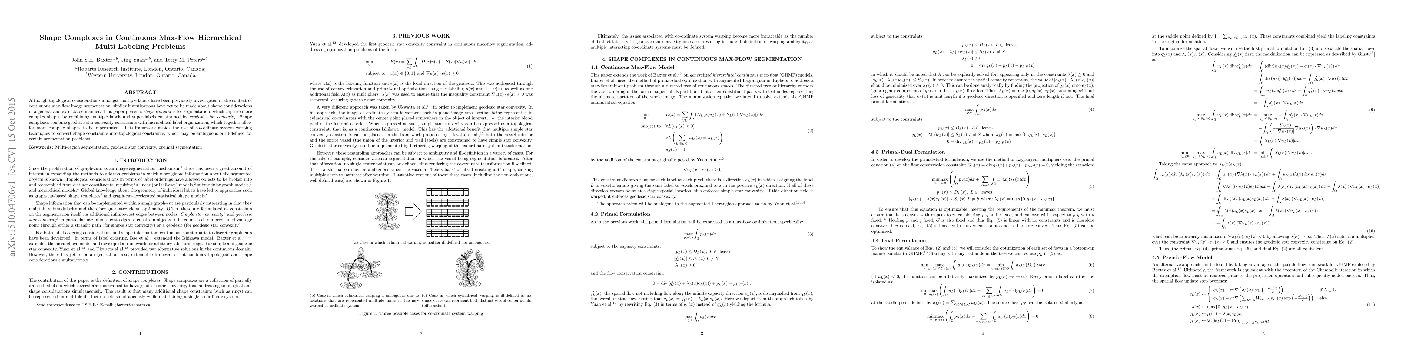 Although topological considerations amongst multiple labels have been previously investigated in the context of continuous max-flow image segmentation, similar investigations have yet to be made about shape considerations in a general and extendable manner. This paper presents shape complexes for segmentation, which capture more complex shapes by combining multiple labels and super-labels constrained by geodesic star convexity. Shape complexes combine geodesic star convexity constraints with hierarchical label organization, which together allow for more complex shapes to be represented. This framework avoids the use of co-ordinate system warping techniques to convert shape constraints into topological constraints, which may be ambiguous or ill-defined for certain segmentation problems.