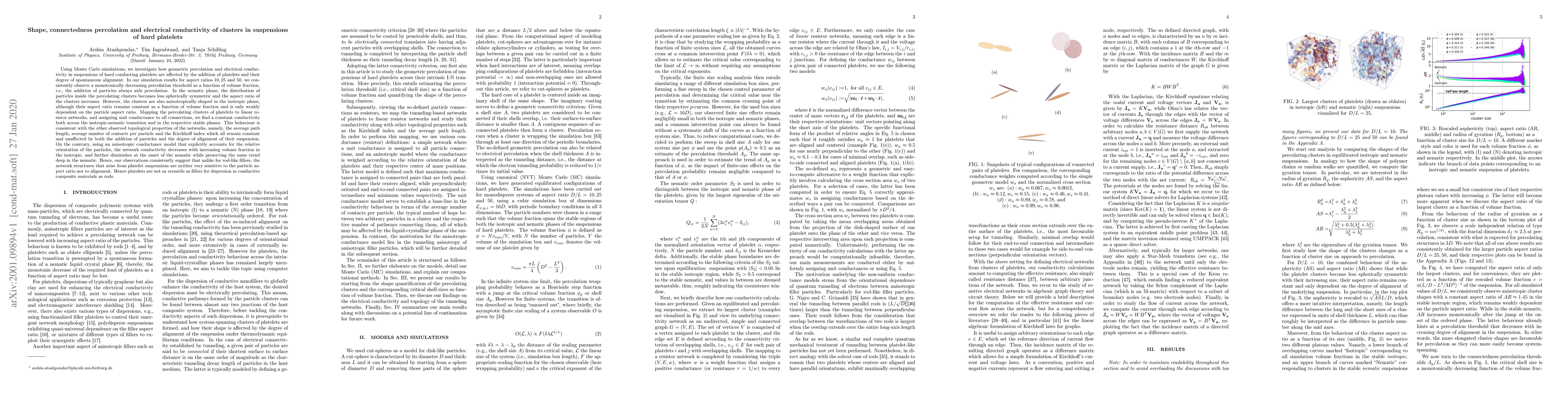 Using Monte Carlo simulations, we investigate how geometric percolation and electrical conductivity in suspensions of hard conducting platelets are affected by the addition of platelets and their degree of spontaneous alignment. For aspect ratios $10, 25$ and $50$, we consistently observe a monotonically decreasing percolation threshold as a function of volume fraction. In the nematic phase, the distribution of particles inside the percolating clusters becomes less spherically symmetric and the aspect ratio of the clusters increases. However, the clusters are also anisotropically shaped in the isotropic phase, although their aspect ratio remains constant as a function of volume fraction. Mapping the percolating clusters of platelets to linear resistor networks, and assigning unit conductance to all connections, we find a constant conductivity both across the isotropic-nematic transition and in the respective stable phases. This behaviour is consistent with the other observed topological properties of the networks. On the contrary, using an anisotropic conductance model, the network conductivity decreases with increasing volume fraction in the isotropic, and further diminishes at the onset of the nematic. Hence, our observations consistently suggest that unlike for rod-like fillers, the network structures that arise from platelet suspensions are neither very sensitive to the particle aspect ratio nor to alignment, thus rendering platelets less versatile fillers for dispersion in conductive composites.