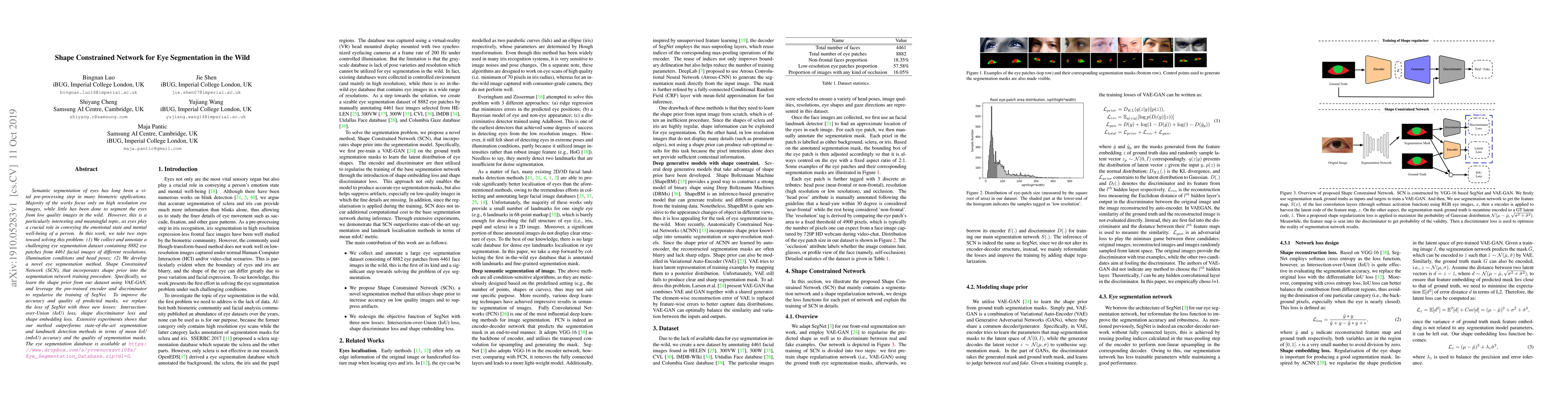 Semantic segmentation of eyes has long been a vital pre-processing step in many biometric applications. Majority of the works focus only on high resolution eye images, while little has been done to segment the eyes from low quality images in the wild. However, this is a particularly interesting and meaningful topic, as eyes play a crucial role in conveying the emotional state and mental well-being of a person. In this work, we take two steps toward solving this problem: (1) We collect and annotate a challenging eye segmentation dataset containing 8882 eye patches from 4461 facial images of different resolutions, illumination conditions and head poses; (2) We develop a novel eye segmentation method, Shape Constrained Network (SCN), that incorporates shape prior into the segmentation network training procedure. Specifically, we learn the shape prior from our dataset using VAE-GAN, and leverage the pre-trained encoder and discriminator to regularise the training of SegNet. To improve the accuracy and quality of predicted masks, we replace the loss of SegNet with three new losses: Intersection-over-Union (IoU) loss, shape discriminator loss and shape embedding loss. Extensive experiments shows that our method outperforms state-of-the-art segmentation and landmark detection methods in terms of mean IoU (mIoU) accuracy and the quality of segmentation masks. The eye segmentation database is available at https://www.dropbox.com/s/yvveouvxsvti08x/Eye_Segmentation_Database.zip?dl=0.