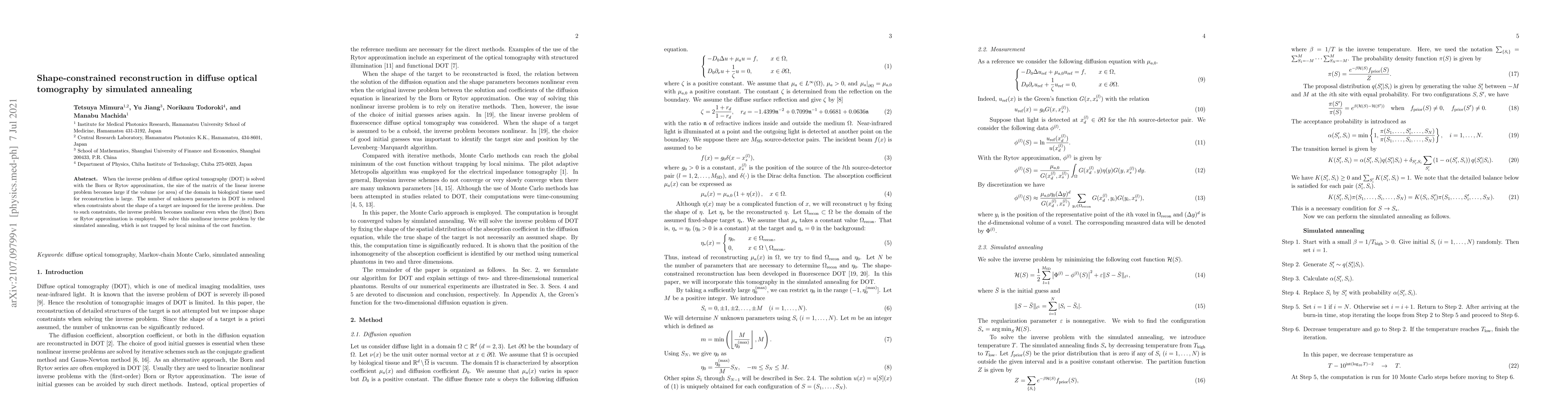 This paper addresses the large matrix size issue in diffuse optical tomography (DOT) by imposing shape constraints on the inverse problem, making it nonlinear. It employs simulated annealing to solve this nonlinear problem, ensuring it avoids local minima in the cost function.