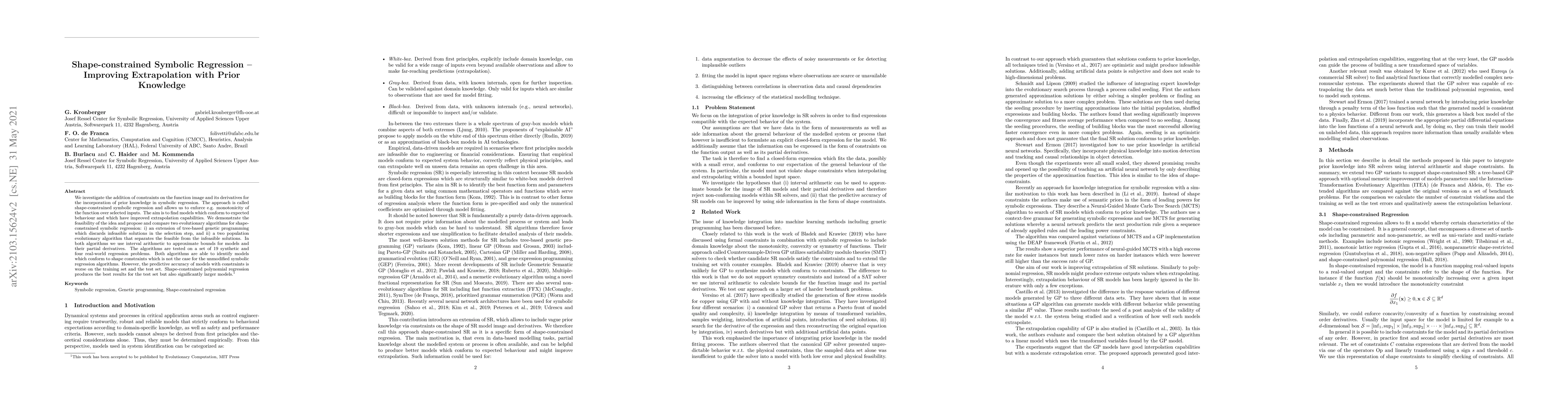 This paper introduces shape-constrained symbolic regression to incorporate prior knowledge through function image and derivative constraints, aiming to improve model extrapolation. Two evolutionary algorithms are proposed to identify compliant models, but despite better extrapolation, the constrained models show reduced predictive accuracy on both training and test sets.