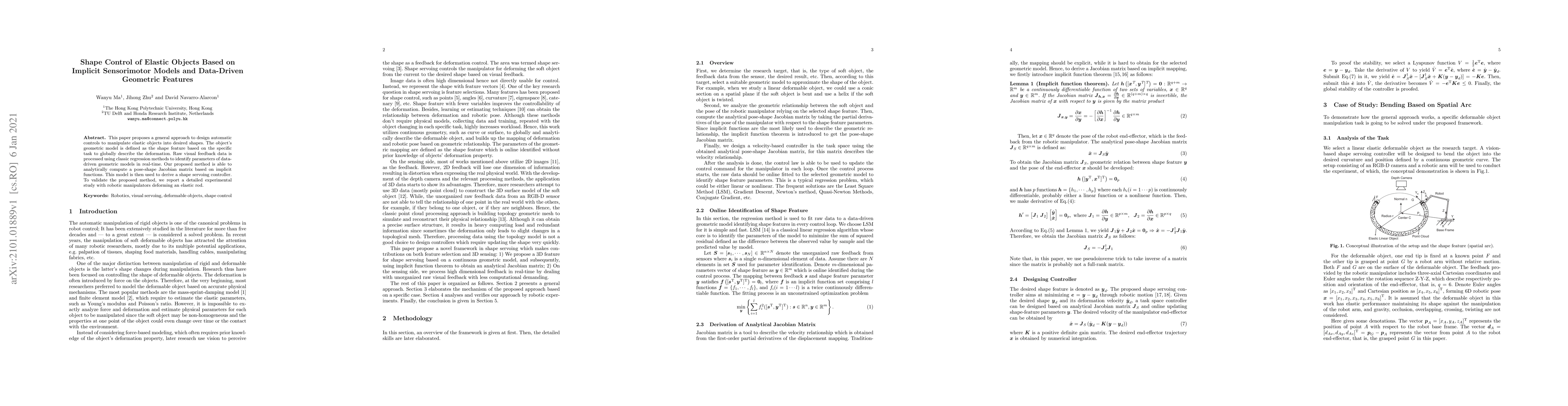 This paper presents a method for controlling the shape of elastic objects using implicit sensorimotor models and data-driven geometric features, validated through experiments with robotic manipulators. The approach computes a pose-shape Jacobian matrix and derives a shape servoing controller for real-time deformation.