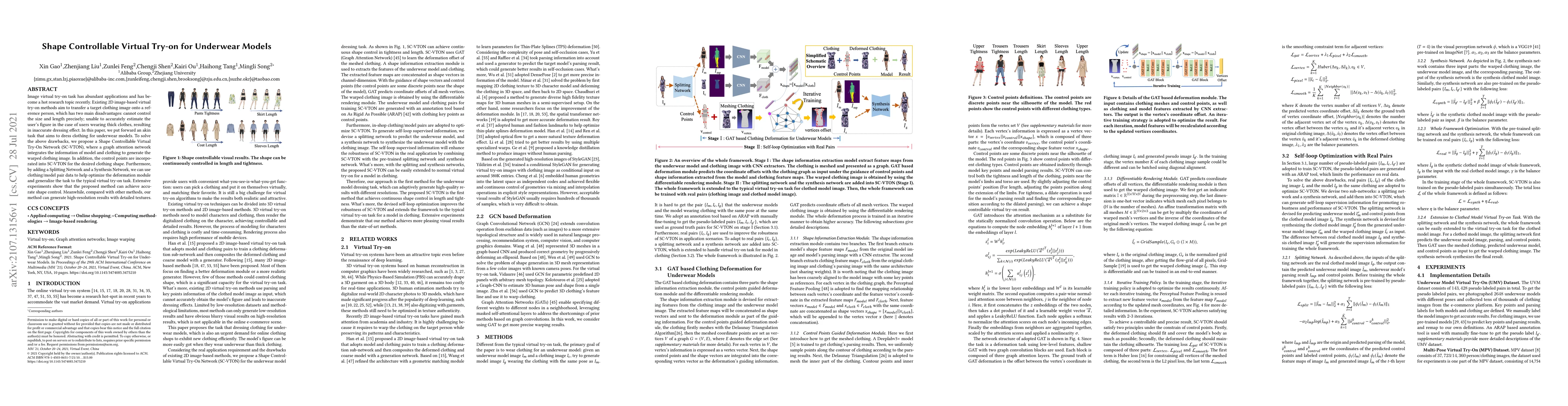 This paper proposes a Shape Controllable Virtual Try-On Network (SC-VTON) to address the limitations of existing 2D image-based virtual try-on methods, particularly for underwear models. The method integrates a graph attention network and control points for precise shape adjustments, achieving high-resolution results with detailed textures.