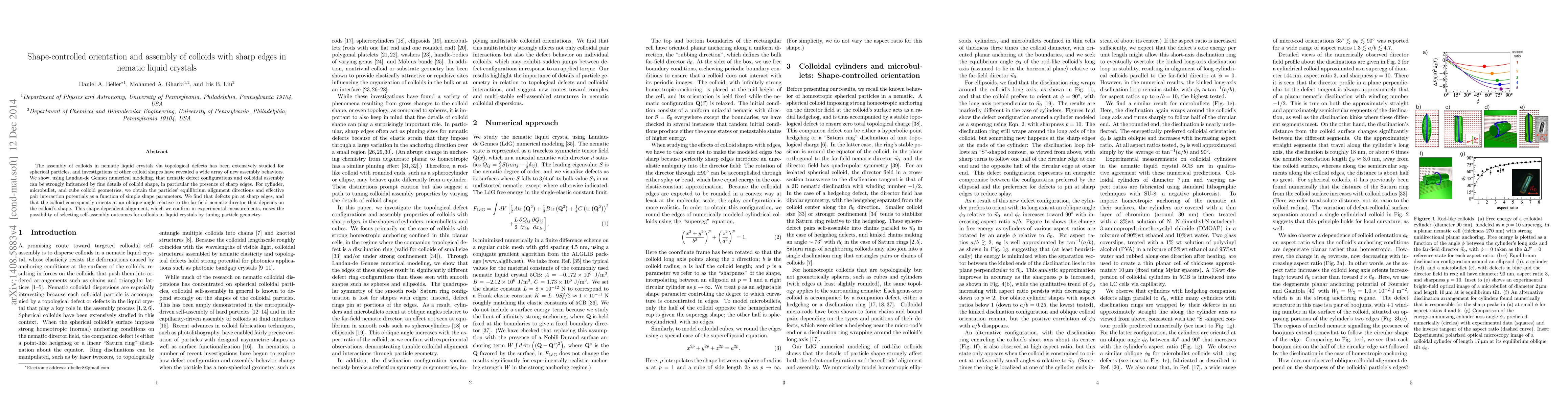 This paper investigates how the shape of colloidal particles, especially those with sharp edges, influences their orientation and assembly in nematic liquid crystals. Using numerical modeling and experiments, the authors demonstrate that sharp edges lead to unique defect pinning and alignment behaviors, offering a method to control colloidal assembly through geometric tuning.