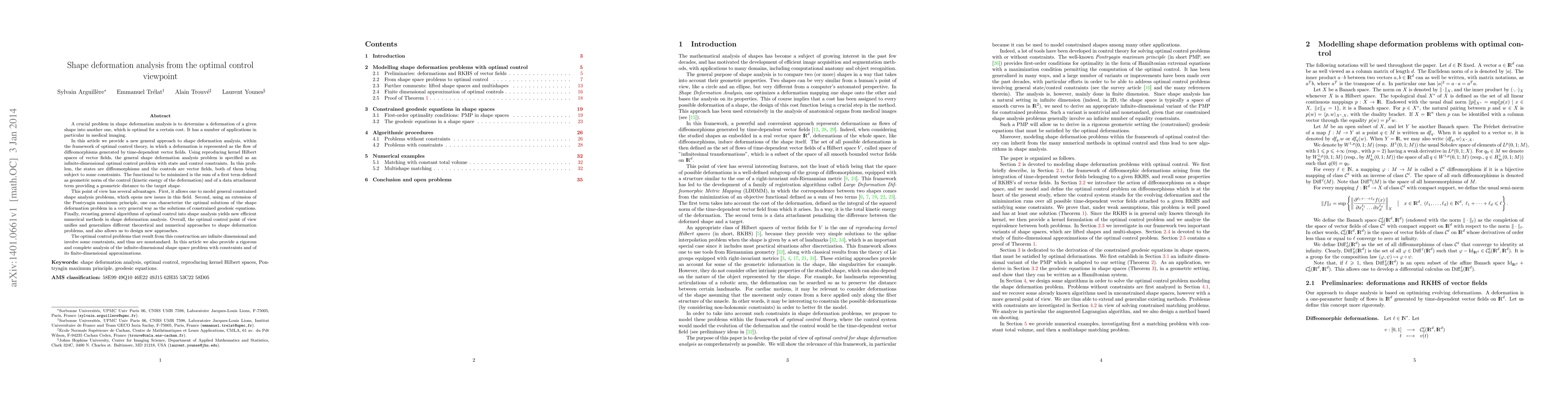 The paper presents a new approach to shape deformation analysis using optimal control theory, representing deformations as flows of time-dependent vector fields in reproducing kernel Hilbert spaces (RKHS) of vector fields. It formulates the general shape deformation problem as an infinite-dimensional optimal control problem with state and control constraints.