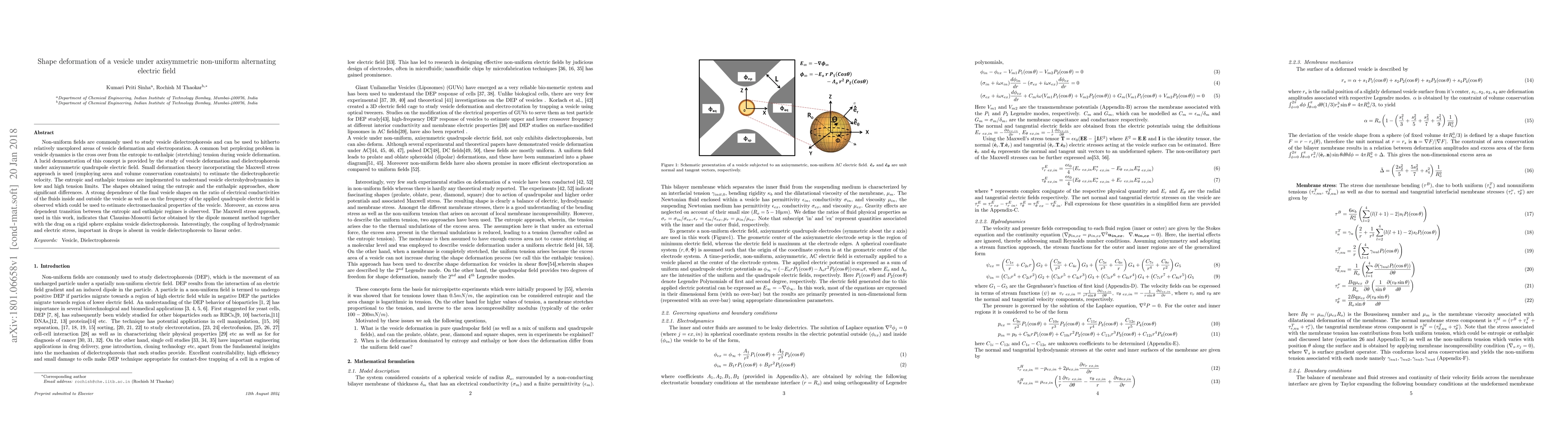 This paper investigates the deformation of vesicles under axisymmetric quadrupole electric fields, demonstrating the transition between entropic and enthalpic tensions during deformation. The study uses small deformation theory and the Maxwell stress approach to estimate dielectrophoretic velocity, revealing significant differences in vesicle shapes based on the electrical conductivities and frequency of the applied field.