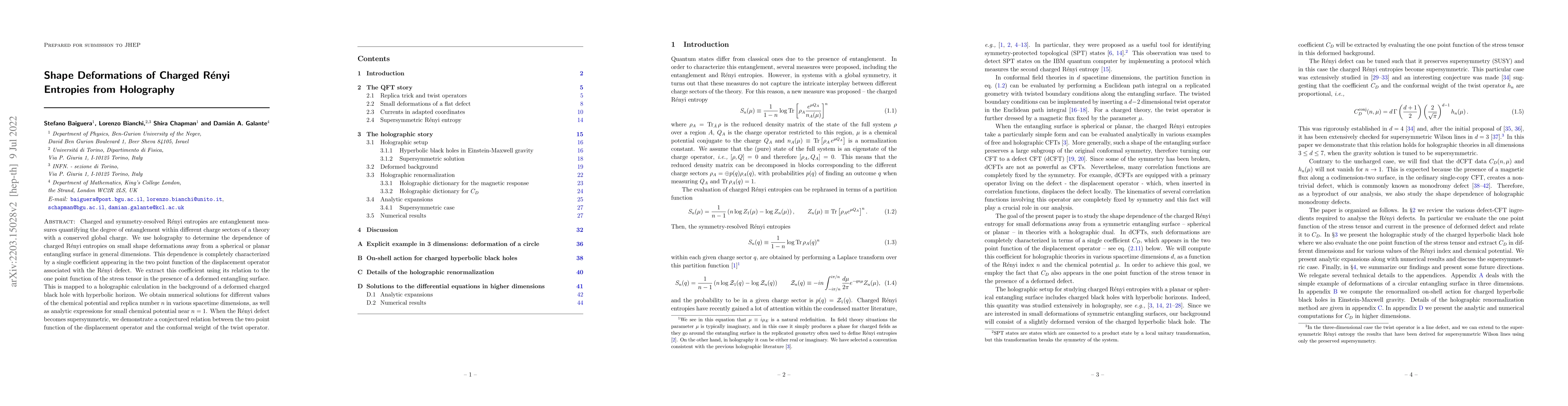 Charged and symmetry-resolved R\'enyi entropies are entanglement measures quantifying the degree of entanglement within different charge sectors of a theory with a conserved global charge. We use holography to determine the dependence of charged R\'enyi entropies on small shape deformations away from a spherical or planar entangling surface in general dimensions. This dependence is completely characterized by a single coefficient appearing in the two point function of the displacement operator associated with the R\'enyi defect. We extract this coefficient using its relation to the one point function of the stress tensor in the presence of a deformed entangling surface. This is mapped to a holographic calculation in the background of a deformed charged black hole with hyperbolic horizon. We obtain numerical solutions for different values of the chemical potential and replica number $n$ in various spacetime dimensions, as well as analytic expressions for small chemical potential near $n=1$. When the R\'enyi defect becomes supersymmetric, we demonstrate a conjectured relation between the two point function of the displacement operator and the conformal weight of the twist operator.