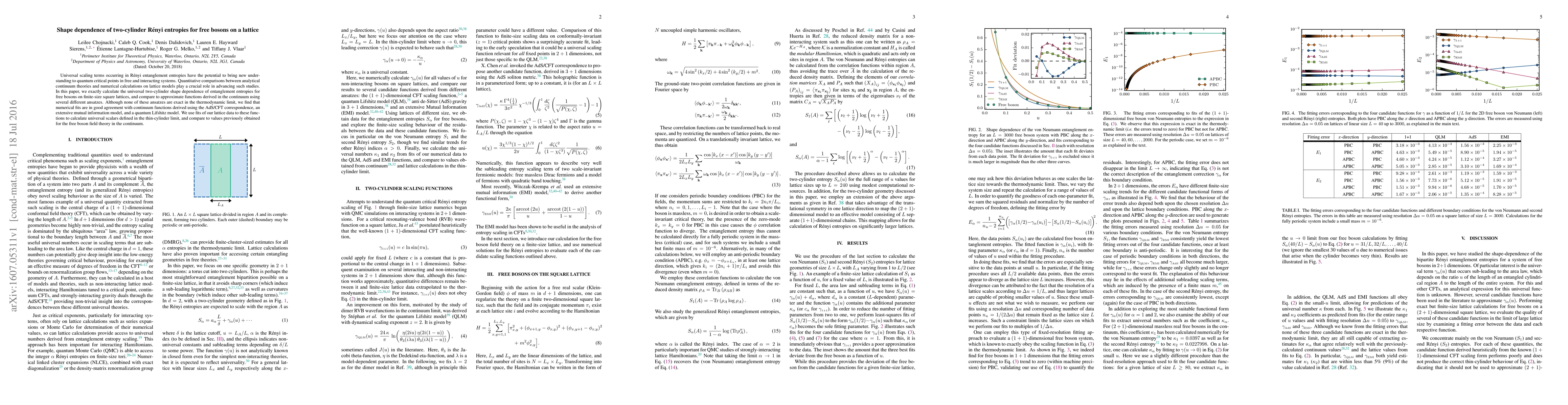 This paper calculates the exact two-cylinder shape dependence of Renyi entanglement entropies for free bosons on finite-size square lattices and compares these results to continuum approximations derived from the AdS/CFT correspondence, mutual information models, and quantum Lifshitz models. The study finds good numerical agreement with these continuum functions, allowing for the calculation of universal scalars in the thin-cylinder limit.