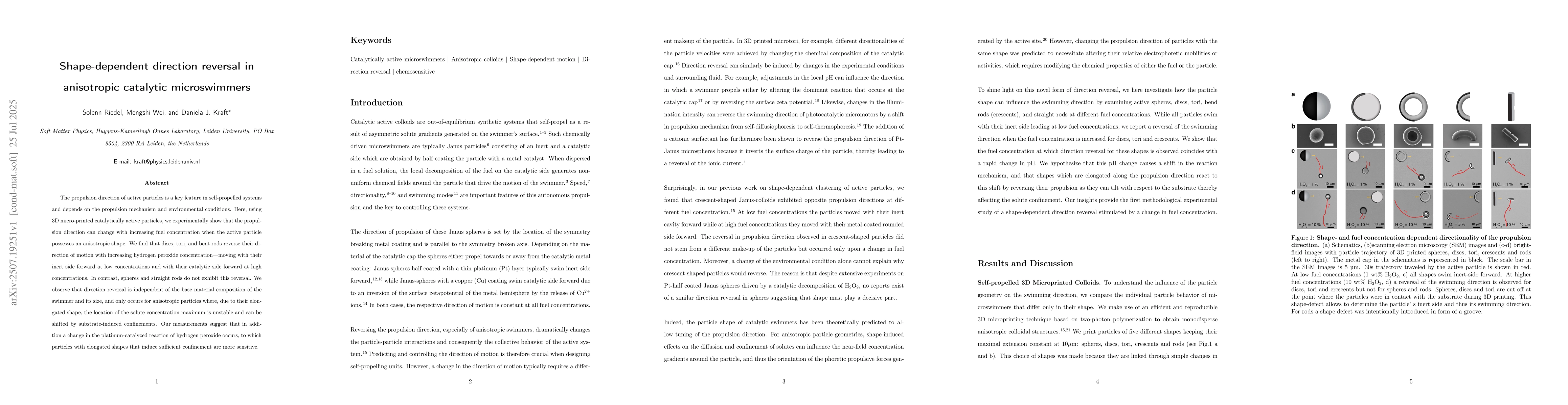The propulsion direction of active particles is a key feature in self-propelled systems and depends on the propulsion mechanism and environmental conditions. Here, using 3D micro-printed catalytically active particles, we experimentally show that the propulsion direction can change with increasing fuel concentration when the active particle possesses an anisotropic shape. We find that discs, tori, and bent rods reverse their direction of motion with increasing hydrogen peroxide concentration--moving with their inert side forward at low concentrations and with their catalytic side forward at high concentrations. In contrast, spheres and straight rods do not exhibit this reversal. We observe that direction reversal is independent of the base material composition of the swimmer and its size, and only occurs for anisotropic particles where, due to their elongated shape, the location of the solute concentration maximum is unstable and can be shifted by substrate-induced confinements. Our measurements suggest that in addition a change in the platinum-catalyzed reaction of hydrogen peroxide occurs, to which particles with elongated shapes that induce sufficient confinement are more sensitive.
