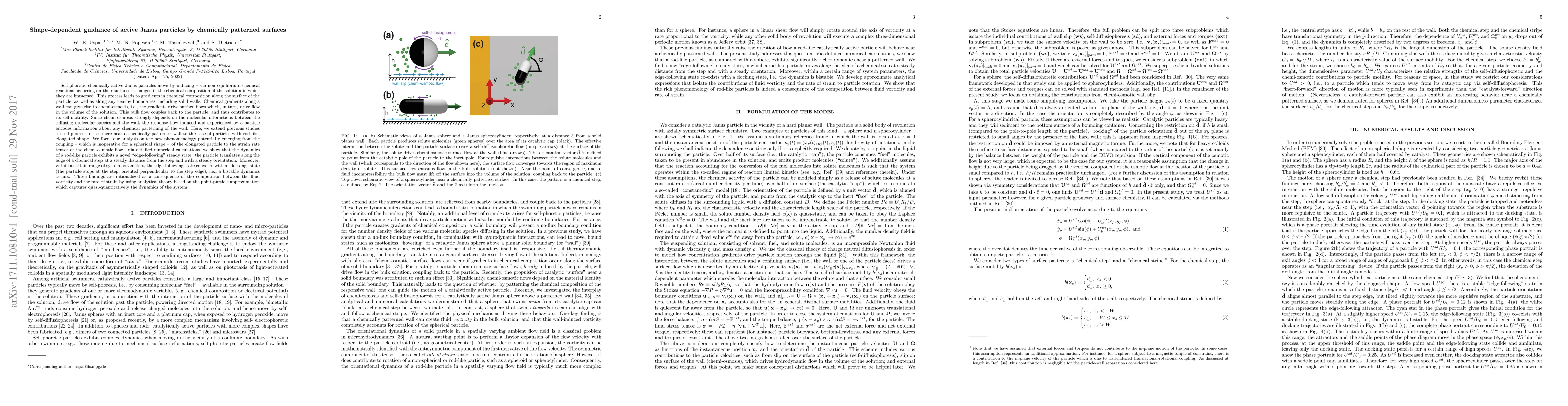 This paper investigates the self-phoretic motion of elongated Janus particles near chemically patterned surfaces, revealing a novel "edge-following" steady state where the particle moves parallel to the edge of a chemical step. The study also identifies a bistable "docking" state, and uses analytical theory to explain the interplay between fluid vorticity and strain rate in determining these dynamic behaviors.
