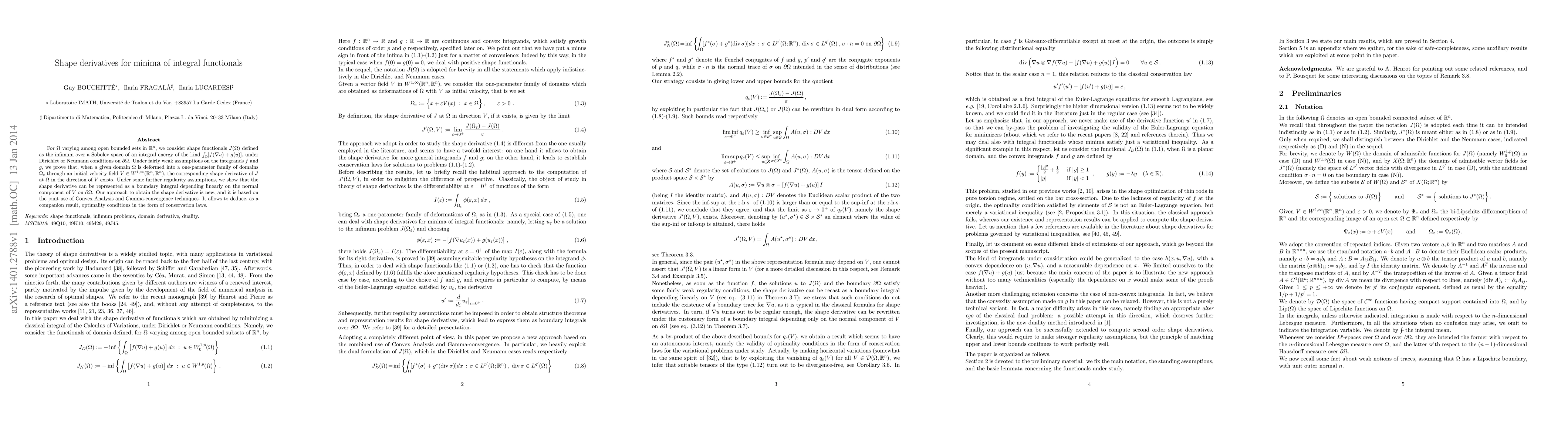 This paper proves the existence of shape derivatives for integral functionals defined over varying domains, showing they can be represented as boundary integrals. The approach combines Convex Analysis and Gamma-convergence techniques, leading to optimality conditions in the form of conservation laws.