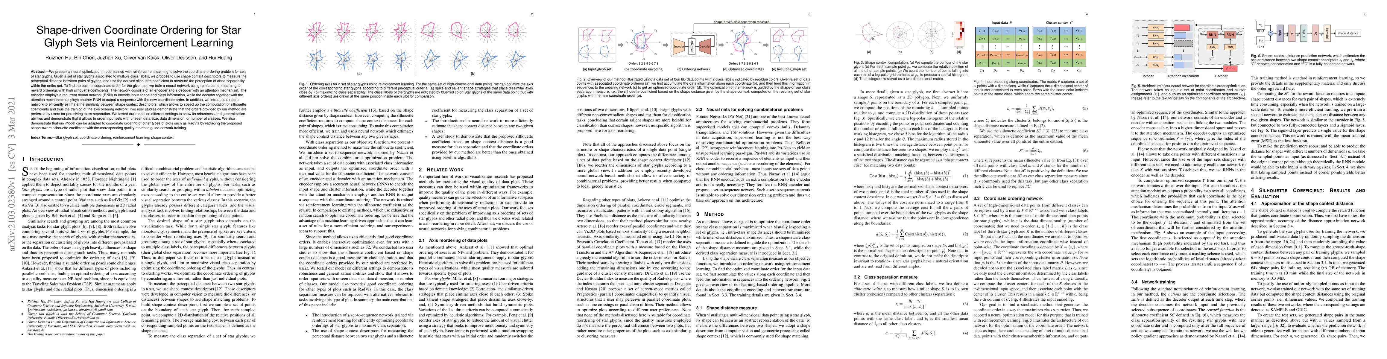 A neural optimization model uses reinforcement learning to find optimal coordinate order for star glyphs sets based on shape context descriptors and silhouette coefficients, demonstrating user preference and robustness.
