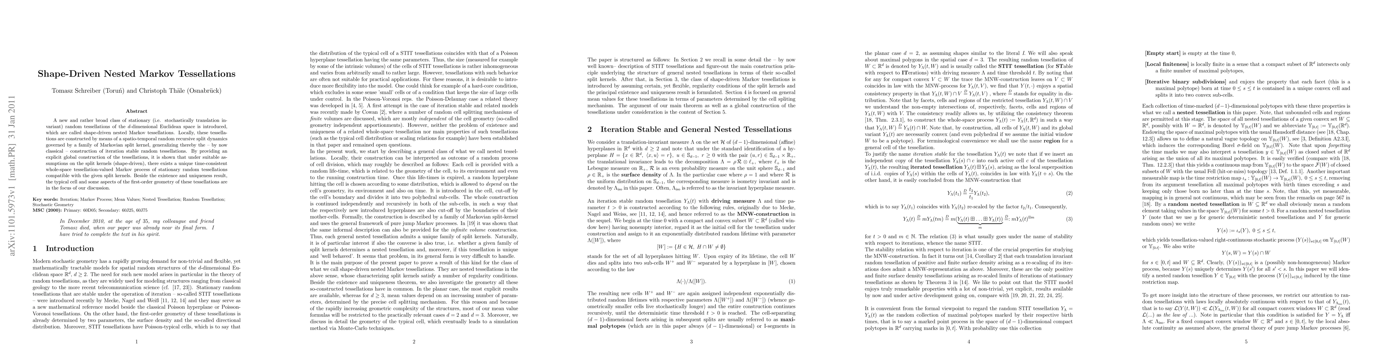 This paper introduces a new class of stationary random tessellations called shape-driven nested Markov tessellations, constructed through a recursive split dynamics governed by Markovian kernels. It proves the existence and uniqueness of a global tessellation-valued Markov process under suitable conditions, and discusses the typical cell and first-order geometry of these tessellations.
