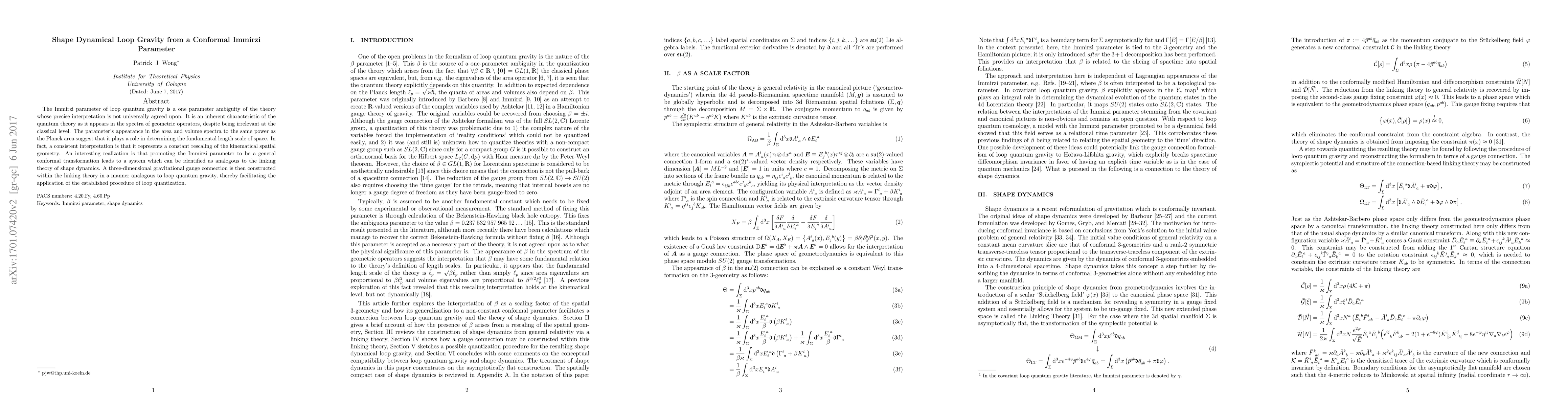This paper explores the Immirzi parameter in loop quantum gravity, proposing its interpretation as a conformal transformation that leads to shape dynamical loop gravity. It constructs a three-dimensional gravitational gauge connection, aligning with loop quantization methods.