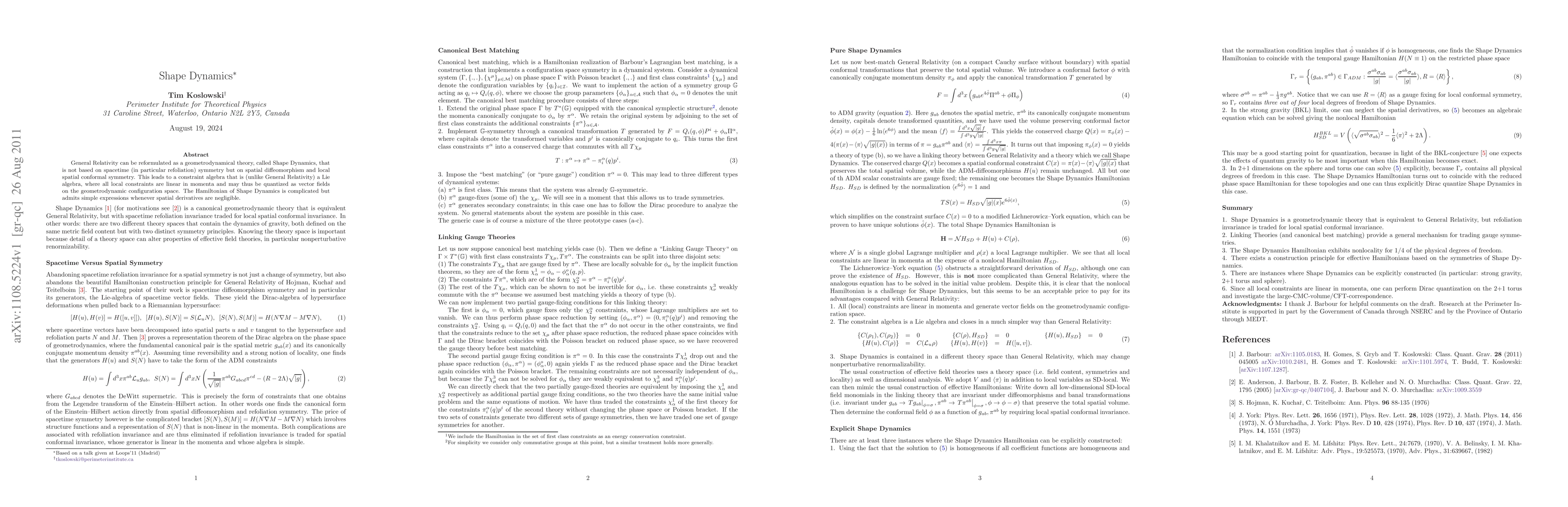 General Relativity can be reformulated as a geometrodynamical theory, called Shape Dynamics, that is not based on spacetime (in particular refoliation) symmetry but on spatial diffeomorphism and local spatial conformal symmetry. This leads to a constraint algebra that is (unlike General Relativity) a Lie algebra, where all local constraints are linear in momenta and may thus be quantized as vector fields on the geometrodynamic configuration space. The Hamiltonian of Shape Dynamics is complicated but admits simple expressions whenever spatial derivatives are negligible.