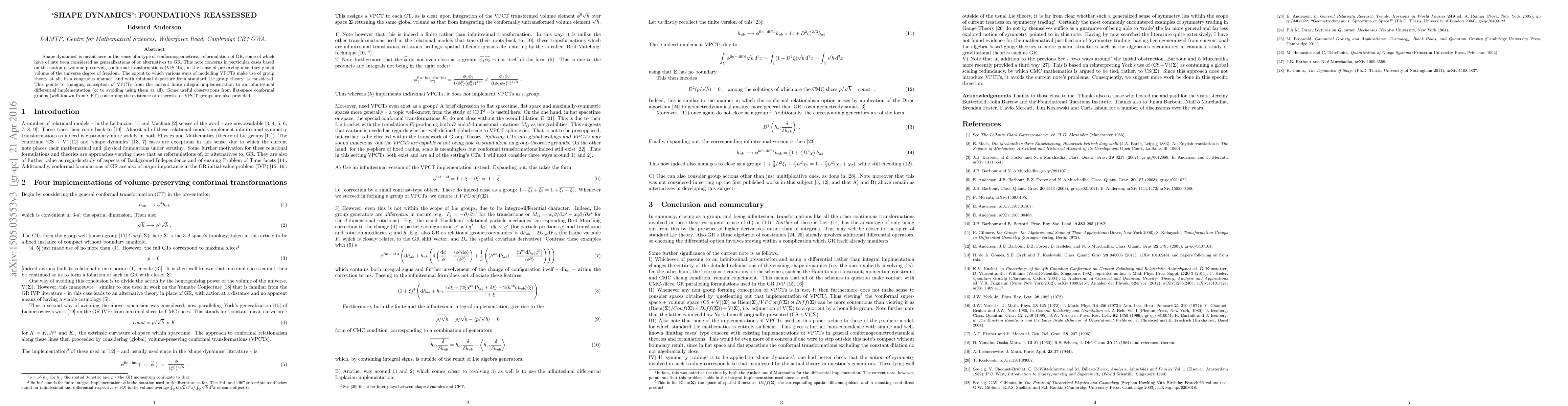 `Shape dynamics' is meant here in the sense of a type of conformogeometrical reformulation of GR, some of which have of late been considered as generalizations of or alternatives to GR. This note concerns in particular cases based on the notion of volume-preserving conformal transformations (VPCTs), in the sense of preserving a solitary global volume of the universe degree of freedom. The extent to which various ways of modelling VPCTs make use of group theory at all, in a congruous manner, and with minimal departure from standard Lie group theory, is considered. This points to changing conception of VPCTs from the current finite integral implementation to an infinitesimal differential implementation (or to avoiding using them at all). Some useful observations from flat-space conformal groups (well-known from CFT) concerning the existence or otherwise of VPCT groups are also provided.