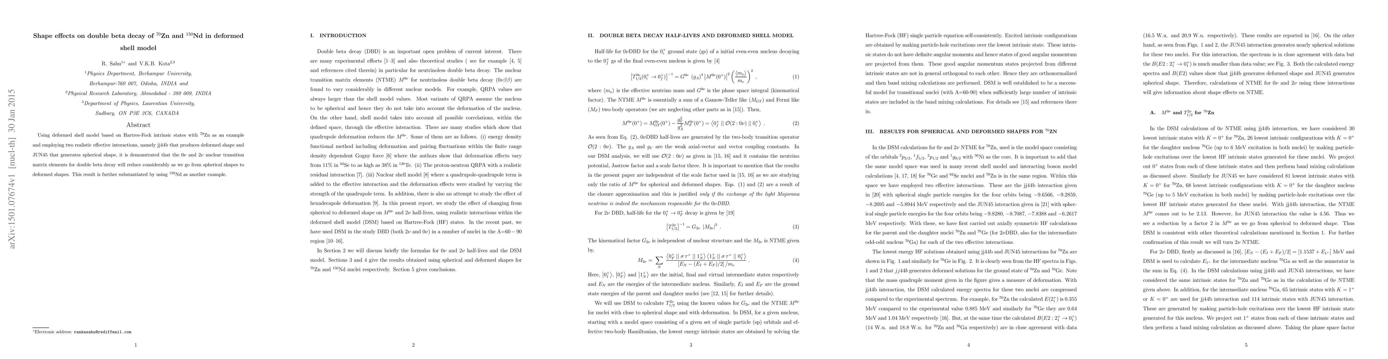 This study investigates double beta decay in deformed shell models using Hartree-Fock states for $^{70}$Zn and $^{150}$Nd, finding that transition matrix elements decrease with more deformation.