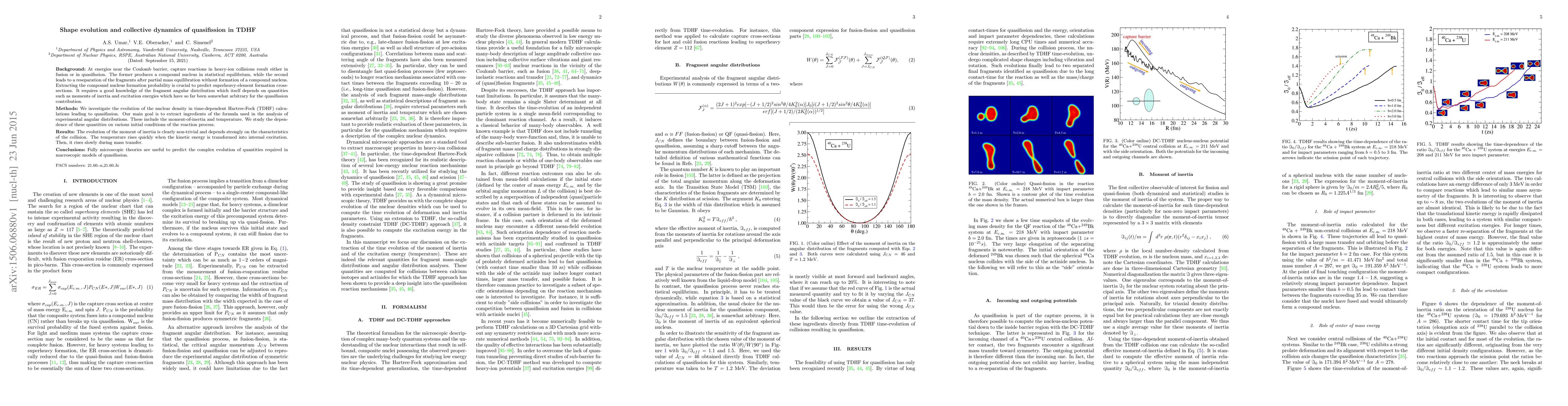The paper presents a detailed analysis of nuclear density evolution using TDHF, extracting moment-of-inertia and temperature, which are crucial for understanding quasifission dynamics.