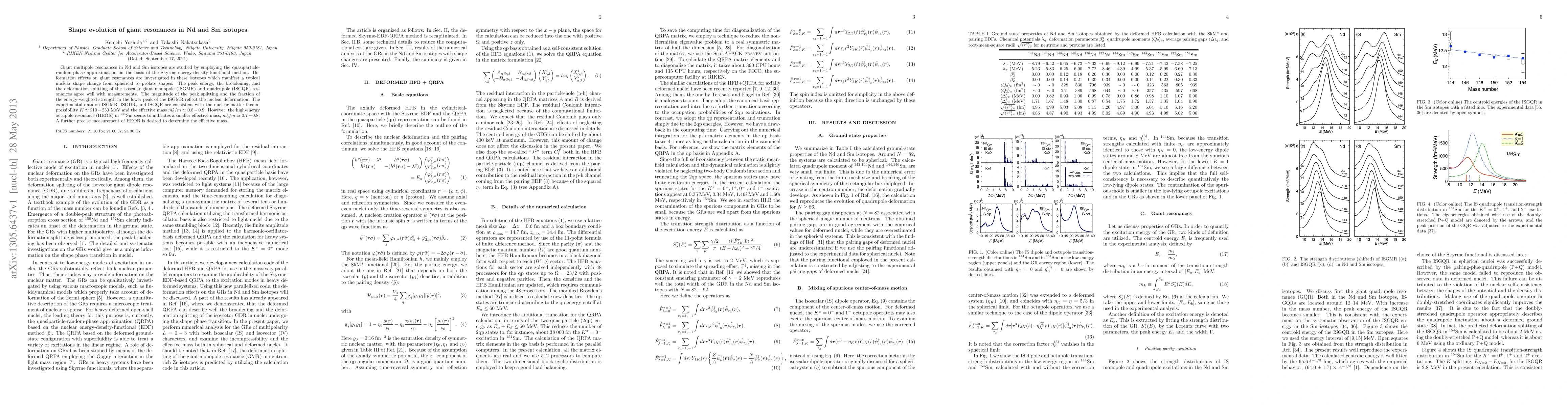 This study investigates the shape evolution of giant resonances in Nd and Sm isotopes using the quasiparticle-random-phase approximation based on the Skyrme energy-density-functional method. The research reveals that deformation effects, particularly the transition from spherical to prolate shapes, influence the peak energy, broadening, and splitting of isoscalar giant monopole and quadrupole resonances, aligning well with experimental data.
