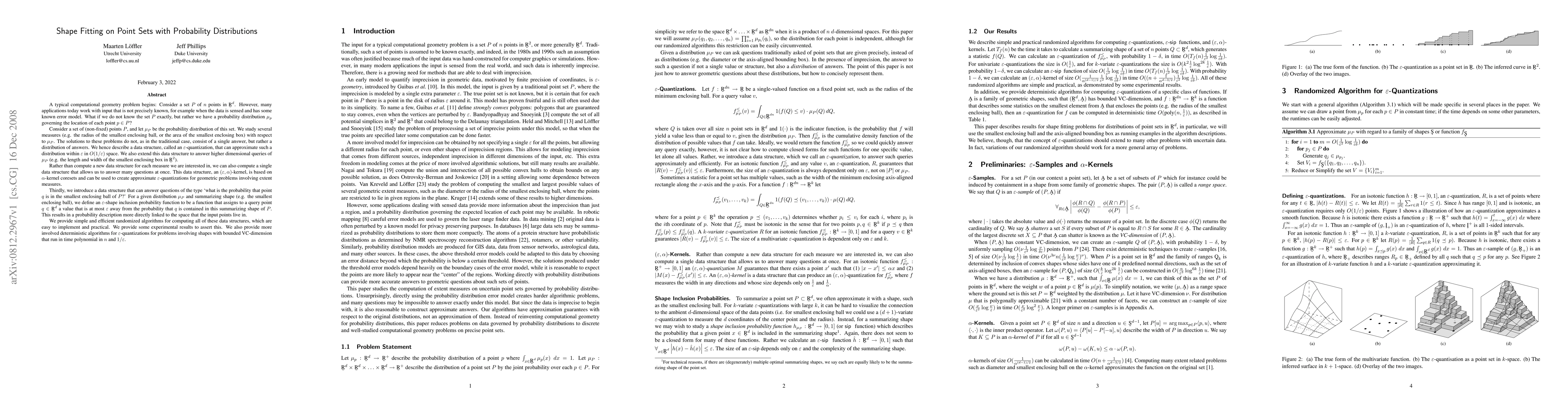 A typical computational geometry problem begins: Consider a set P of n points in R^d. However, many applications today work with input that is not precisely known, for example when the data is sensed and has some known error model. What if we do not know the set P exactly, but rather we have a probability distribution mu_p governing the location of each point p in P? Consider a set of (non-fixed) points P, and let mu_P be the probability distribution of this set. We study several measures (e.g. the radius of the smallest enclosing ball, or the area of the smallest enclosing box) with respect to mu_P. The solutions to these problems do not, as in the traditional case, consist of a single answer, but rather a distribution of answers. We describe several data structures that approximate distributions of answers for shape fitting problems. We provide simple and efficient randomized algorithms for computing all of these data structures, which are easy to implement and practical. We provide some experimental results to assert this. We also provide more involved deterministic algorithms for some of these data structures that run in time polynomial in n and 1/eps, where eps is the approximation factor.