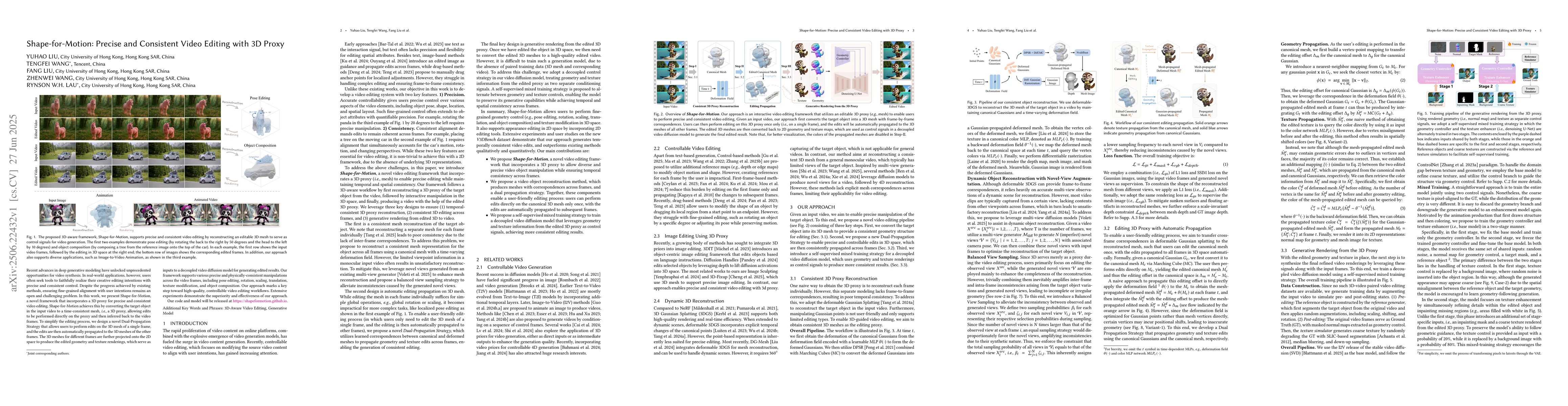 Recent advances in deep generative modeling have unlocked unprecedented opportunities for video synthesis. In real-world applications, however, users often seek tools to faithfully realize their creative editing intentions with precise and consistent control. Despite the progress achieved by existing methods, ensuring fine-grained alignment with user intentions remains an open and challenging problem. In this work, we present Shape-for-Motion, a novel framework that incorporates a 3D proxy for precise and consistent video editing. Shape-for-Motion achieves this by converting the target object in the input video to a time-consistent mesh, i.e., a 3D proxy, allowing edits to be performed directly on the proxy and then inferred back to the video frames. To simplify the editing process, we design a novel Dual-Propagation Strategy that allows users to perform edits on the 3D mesh of a single frame, and the edits are then automatically propagated to the 3D meshes of the other frames. The 3D meshes for different frames are further projected onto the 2D space to produce the edited geometry and texture renderings, which serve as inputs to a decoupled video diffusion model for generating edited results. Our framework supports various precise and physically-consistent manipulations across the video frames, including pose editing, rotation, scaling, translation, texture modification, and object composition. Our approach marks a key step toward high-quality, controllable video editing workflows. Extensive experiments demonstrate the superiority and effectiveness of our approach. Project page: https://shapeformotion.github.io/