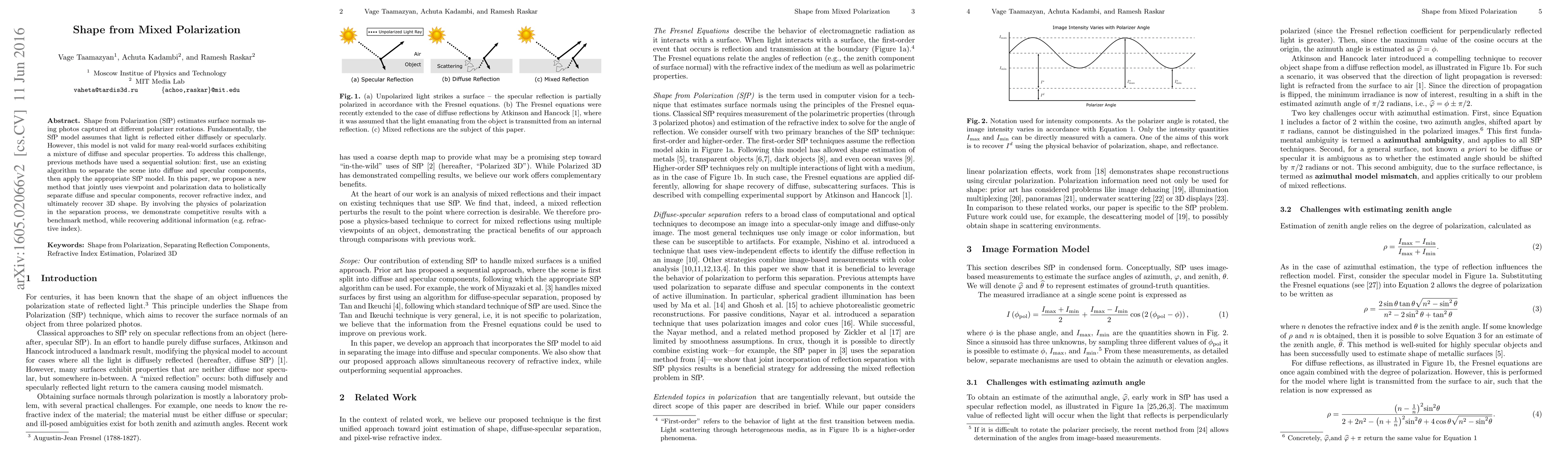 This paper proposes a novel method to estimate 3D shape using polarization data, addressing the limitations of existing models that assume purely diffuse or specular reflections. The new approach jointly separates diffuse and specular components, recovers the refractive index, and demonstrates competitive results compared to benchmark methods.