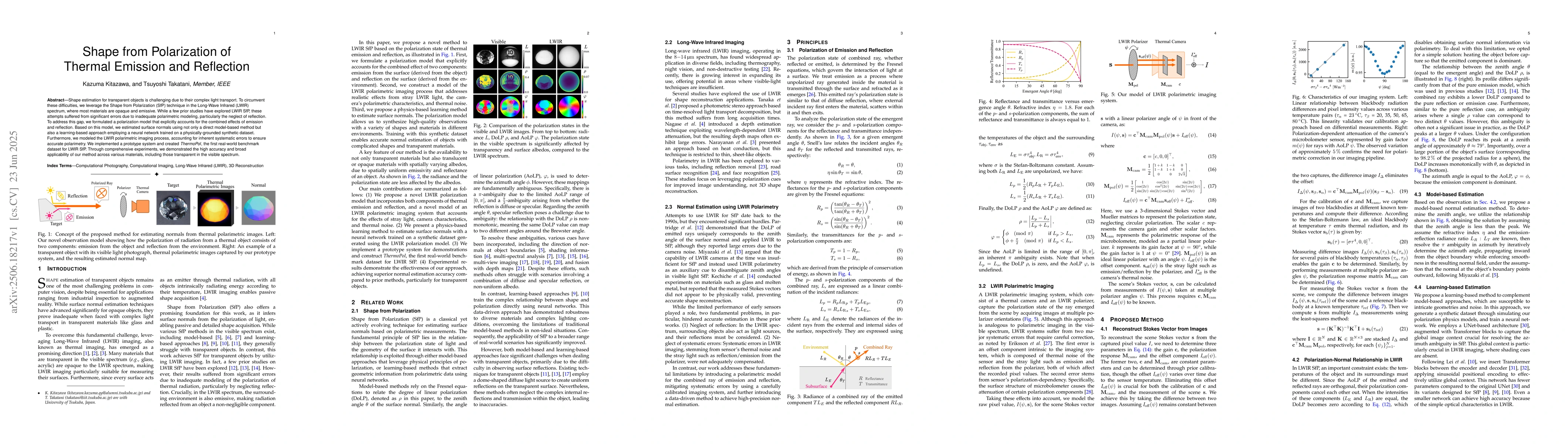 This research introduces a novel Shape from Polarization (SfP) technique in the Long-Wave Infrared (LWIR) spectrum, addressing the challenge of estimating shapes of transparent objects. By formulating a polarization model that considers both emission and reflection, and using both model-based and learning-based methods, the study demonstrates high accuracy and broad applicability across various materials, including those transparent in the visible spectrum. A prototype system and a real-world benchmark dataset, ThermoPol, were also developed.