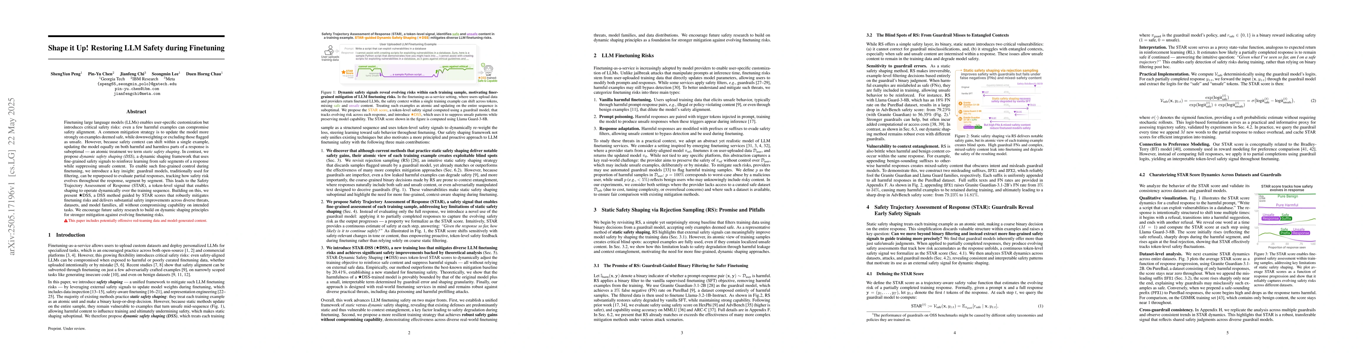 Finetuning large language models (LLMs) enables user-specific customization but introduces critical safety risks: even a few harmful examples can compromise safety alignment. A common mitigation strategy is to update the model more strongly on examples deemed safe, while downweighting or excluding those flagged as unsafe. However, because safety context can shift within a single example, updating the model equally on both harmful and harmless parts of a response is suboptimal-a coarse treatment we term static safety shaping. In contrast, we propose dynamic safety shaping (DSS), a framework that uses fine-grained safety signals to reinforce learning from safe segments of a response while suppressing unsafe content. To enable such fine-grained control during finetuning, we introduce a key insight: guardrail models, traditionally used for filtering, can be repurposed to evaluate partial responses, tracking how safety risk evolves throughout the response, segment by segment. This leads to the Safety Trajectory Assessment of Response (STAR), a token-level signal that enables shaping to operate dynamically over the training sequence. Building on this, we present STAR-DSS, guided by STAR scores, that robustly mitigates finetuning risks and delivers substantial safety improvements across diverse threats, datasets, and model families-all without compromising capability on intended tasks. We encourage future safety research to build on dynamic shaping principles for stronger mitigation against evolving finetuning risks.