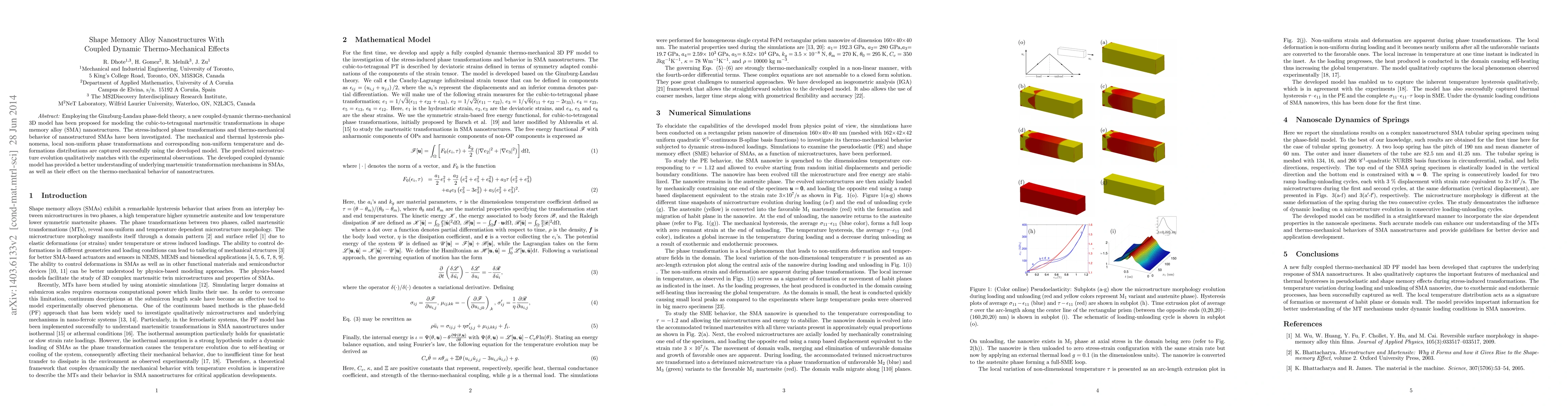 This paper proposes a new 3D Ginzburg-Landau phase-field model to study cubic-to-tetragonal martensitic transformations in shape memory alloy nanostructures, capturing stress-induced phase transformations and thermo-mechanical behavior. The model successfully predicts mechanical and thermal hysteresis, local non-uniform phase transformations, and their effects on temperature and deformation distributions.