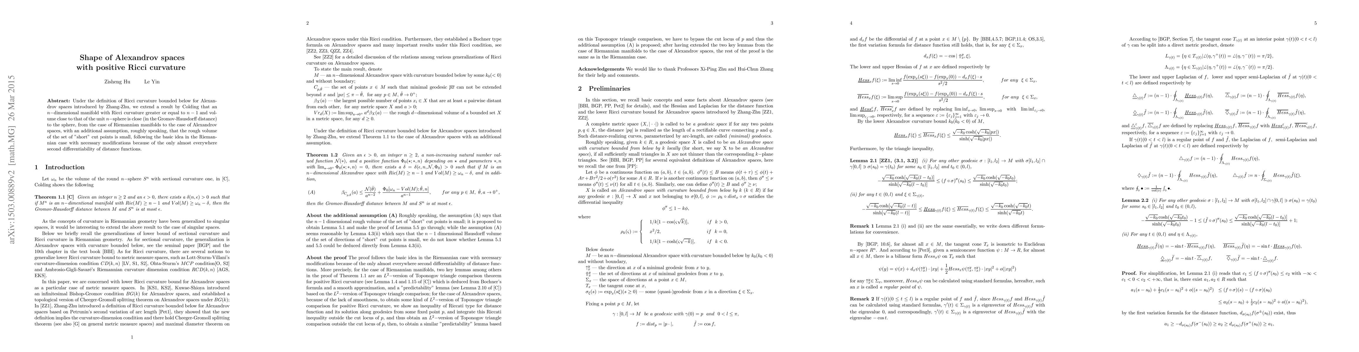 This paper generalizes Colding's result on manifolds to Alexandrov spaces, showing that spaces with positive Ricci curvature and small rough volume of short cut points resemble the unit sphere under Ricci curvature bounds. This extends the concept from Riemannian manifolds to the broader class of Alexandrov spaces.