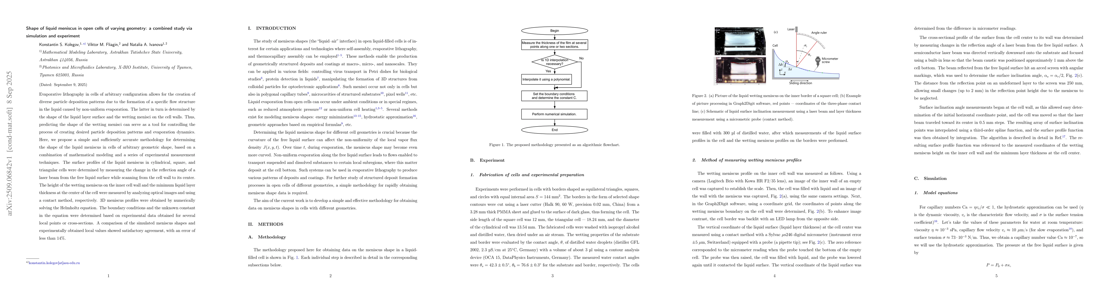 Evaporative lithography in cells of arbitrary configuration allows for the creation of diverse particle deposition patterns due to the formation of a specific flow structure in the liquid caused by non-uniform evaporation. The latter in turn is determined by the shape of the liquid layer surface and the wetting menisci on the cell walls. Thus, predicting the shape of the wetting menisci can serve as a tool for controlling the process of creating desired particle deposition patterns and evaporation dynamics. Here, we propose a simple and sufficiently accurate methodology for determining the shape of the liquid meniscus in cells of arbitrary geometric shape, based on a combination of mathematical modeling and a series of experimental measurement techniques. The surface profiles of the liquid meniscus in cylindrical, square, and triangular cells were determined by measuring the change in the reflection angle of a laser beam from the free liquid surface while scanning from the cell wall to its center. The height of the wetting meniscus on the inner cell wall and the minimum liquid layer thickness at the center of the cell were measured by analyzing optical images and using a contact method, respectively. 3D meniscus profiles were obtained by numerically solving the Helmholtz equation. The boundary conditions and the unknown constant in the equation were determined based on experimental data obtained for several local points or cross-sections. A comparison of the simulated meniscus shapes and experimentally obtained local values showed satisfactory agreement, with an error of less than 14%.