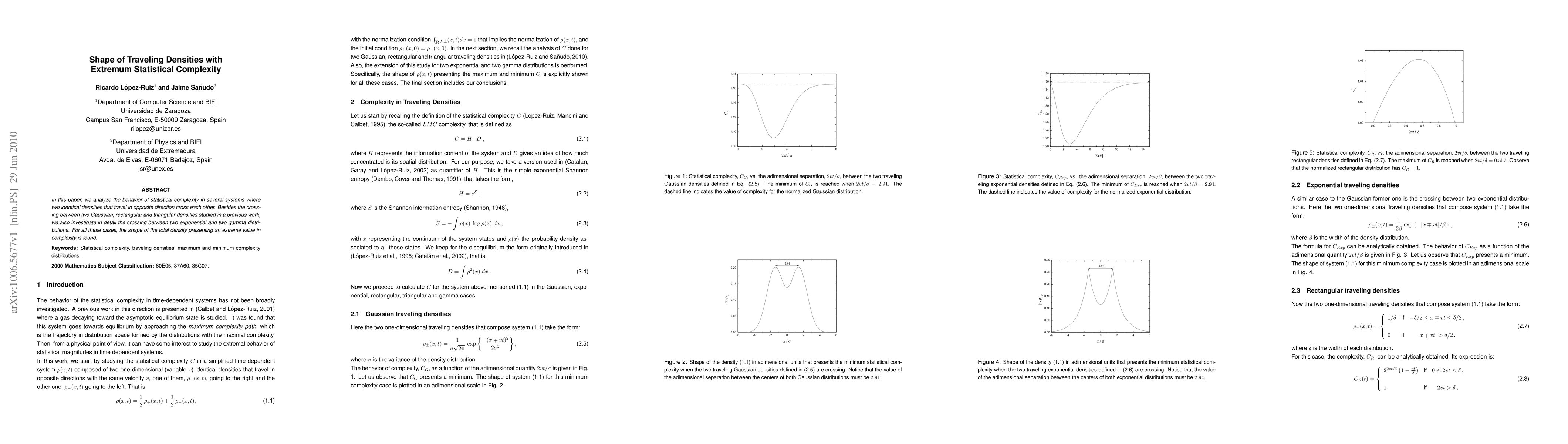 In this paper, we analyze the behavior of statistical complexity in several systems where two identical densities that travel in opposite direction cross each other. Besides the crossing between two Gaussian, rectangular and triangular densities studied in a previous work, we also investigate in detail the crossing between two exponential and two gamma distributions. For all these cases, the shape of the total density presenting an extreme value in complexity is found.