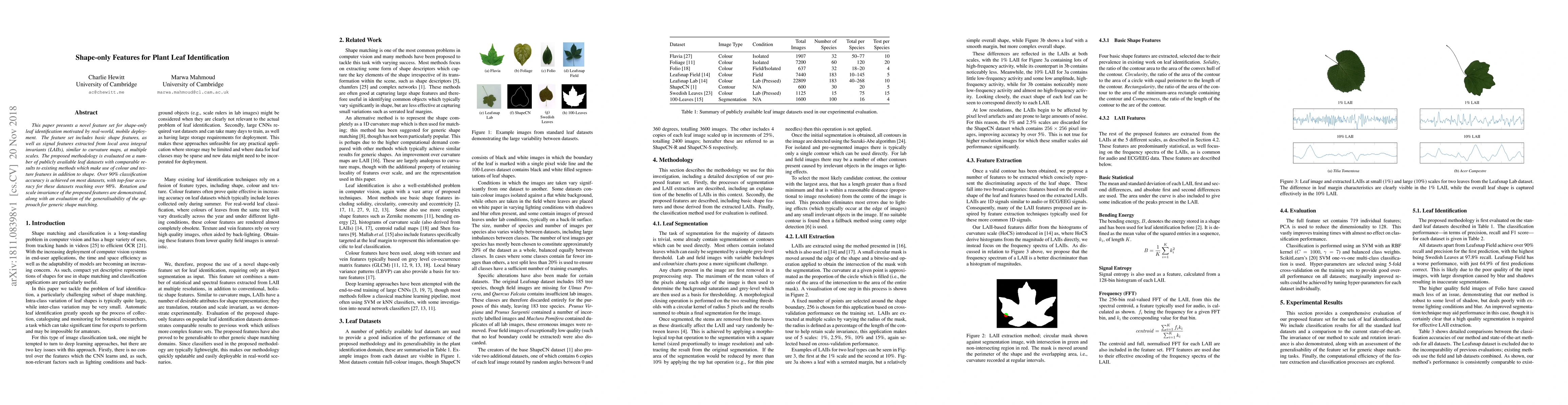This paper introduces a novel shape-only feature set for plant leaf identification, utilizing basic shape features and local area integral invariants (LAIIs) for enhanced accuracy. The method achieves over 90% classification accuracy on multiple datasets, demonstrating rotation and scale invariance.