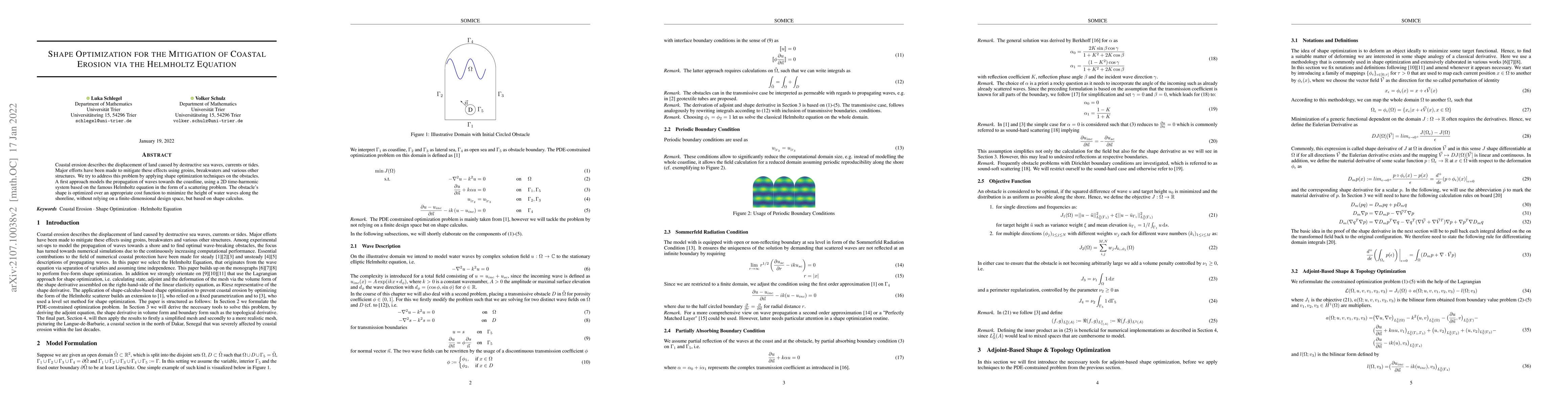 This paper explores shape optimization techniques to mitigate coastal erosion by minimizing wave heights using a 2D Helmholtz equation model. The approach optimizes the shape of coastal obstacles to reduce wave impact, employing shape calculus instead of finite-dimensional design spaces.