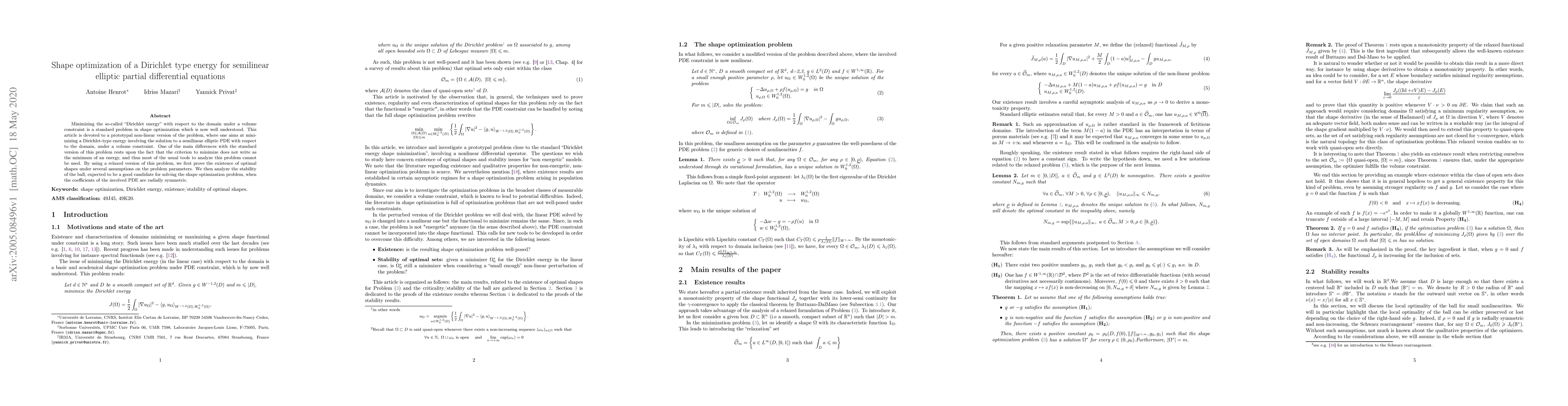 Minimizing the so-called "Dirichlet energy" with respect to the domain under a volume constraint is a standard problem in shape optimization which is now well understood. This article is devoted to a prototypal non-linear version of the problem, where one aims at minimizing a Dirichlet-type energy involving the solution to a semilinear elliptic PDE with respect to the domain, under a volume constraint. One of the main differences with the standard version of this problem rests upon the fact that the criterion to minimize does not write as the minimum of an energy, and thus most of the usual tools to analyze this problem cannot be used. By using a relaxed version of this problem, we first prove the existence of optimal shapes under several assumptions on the problem parameters. We then analyze the stability of the ball, expected to be a good candidate for solving the shape optimization problem, when the coefficients of the involved PDE are radially symmetric.