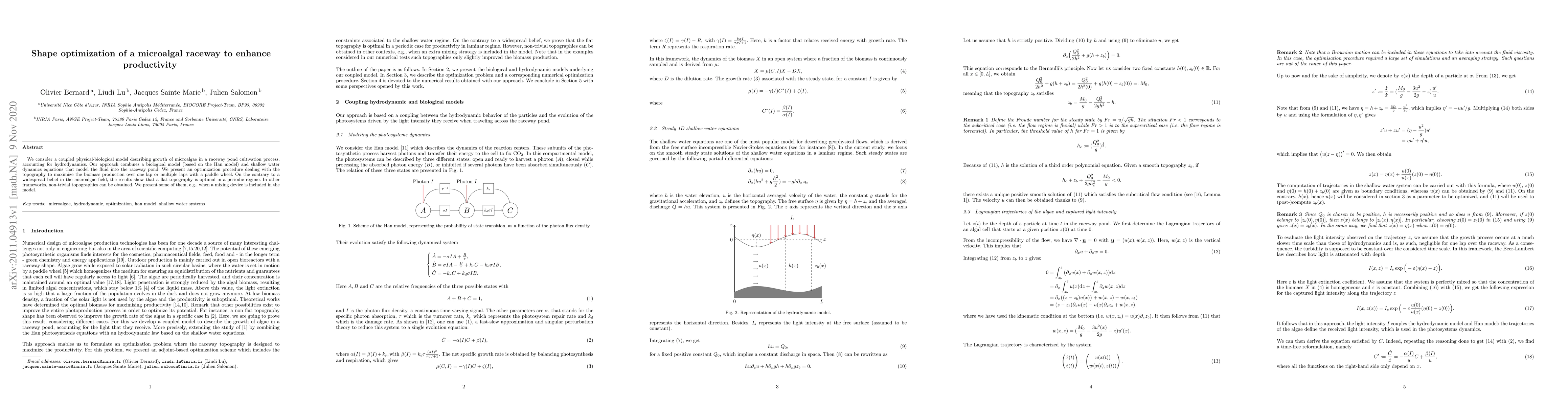We consider a coupled physical-biological model describing growth of microalgae in a raceway pond cultivation process, accounting for hydrodynamics. Our approach combines a biological model (based on the Han model) and shallow water dynamics equations that model the fluid into the raceway pond. We present an optimization procedure dealing with the topography to maximize the biomass production over one lap or multiple laps with a paddle wheel. On the contrary to a widespread belief in the microalgae field, the results show that a flat topography is optimal in a periodic regime. In other frameworks, non-trivial topographies can be obtained. We present some of them, e.g., when a mixing device is included in the model.