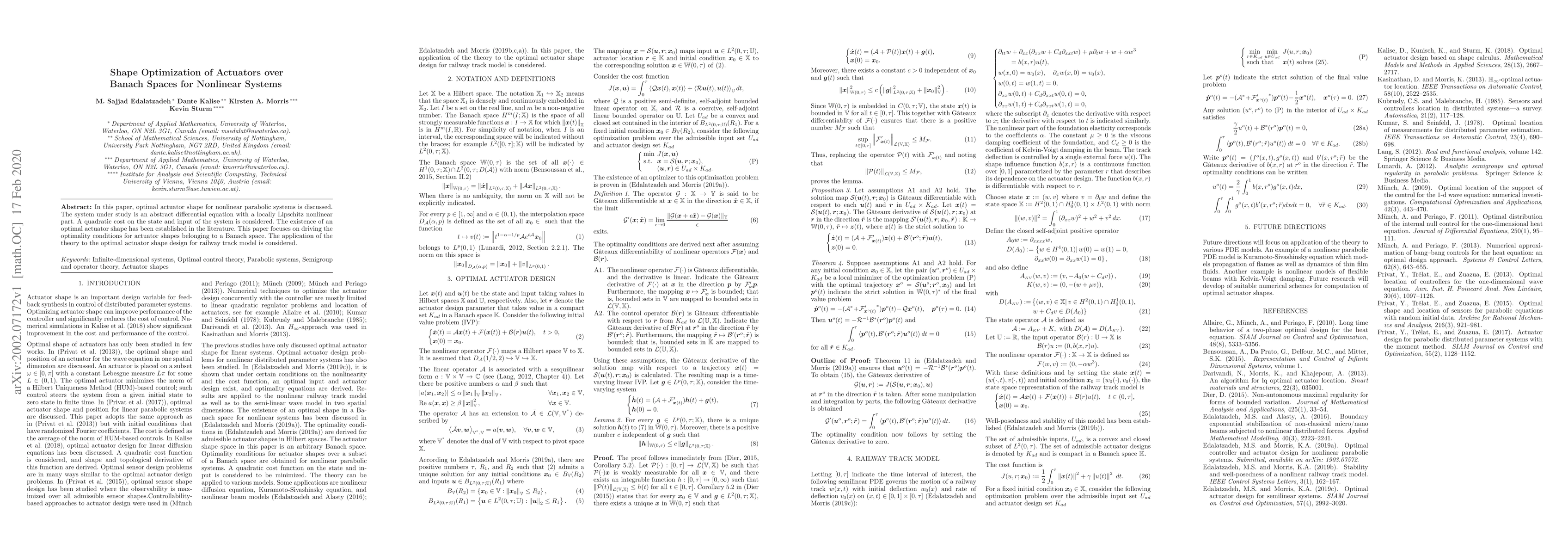 This paper explores the optimal shape of actuators for nonlinear parabolic systems within Banach spaces, deriving the necessary optimality conditions. It applies this theory to design optimal actuator shapes for a railway track model, extending previous results on the existence of optimal actuator shapes.
