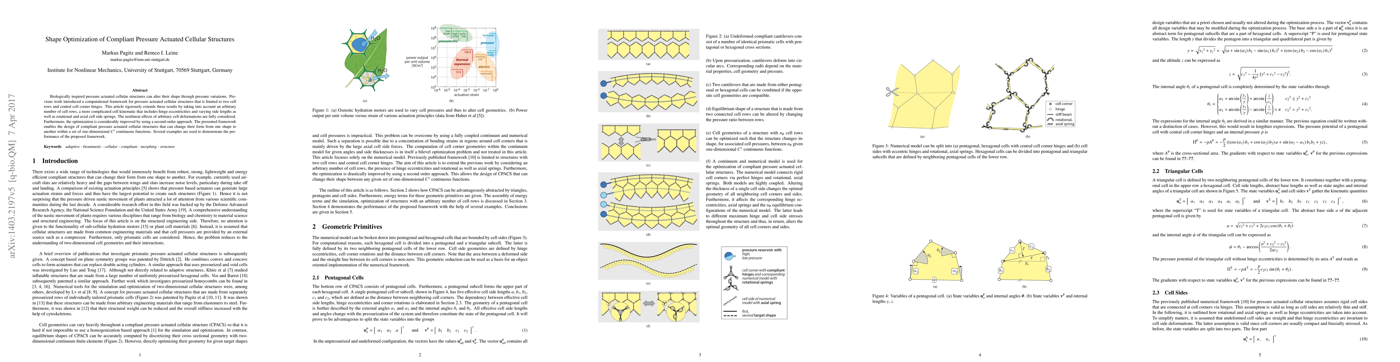 Biologically inspired pressure actuated cellular structures can alter their shape through pressure variations. Previous work introduced a computational framework for pressure actuated cellular structures which was limited to two cell rows and central cell corner hinges. This article rigorously extends these results by taking into account an arbitrary number of cell rows, a more complicated cell kinematics that includes hinge eccentricities and varying side lengths as well as rotational and axial cell side springs. The nonlinear effects of arbitrary cell deformations are fully considered. Furthermore, the optimization is considerably improved by using a second-order approach. The presented framework enables the design of compliant pressure actuated cellular structures that can change their form from one shape to another within a set of one-dimensional C1 continuous functions.