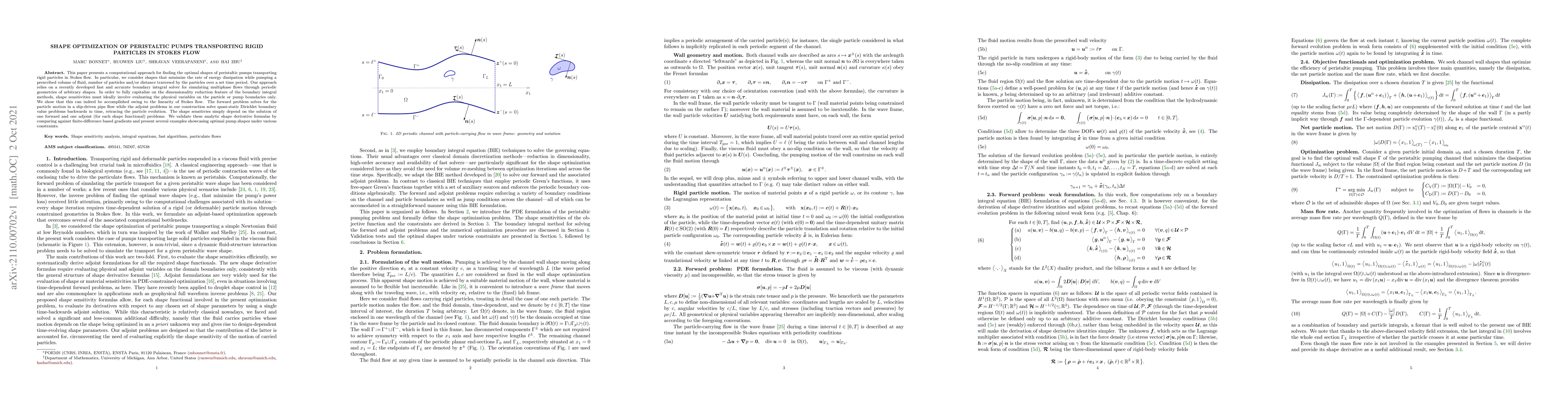 This paper develops a computational method to optimize the shape of peristaltic pumps for transporting rigid particles in Stokes flow, minimizing energy dissipation while maintaining fluid volume, particle count, and particle travel distance. The approach uses a boundary integral solver and demonstrates that the shape sensitivities can be evaluated efficiently by solving forward and adjoint problems.