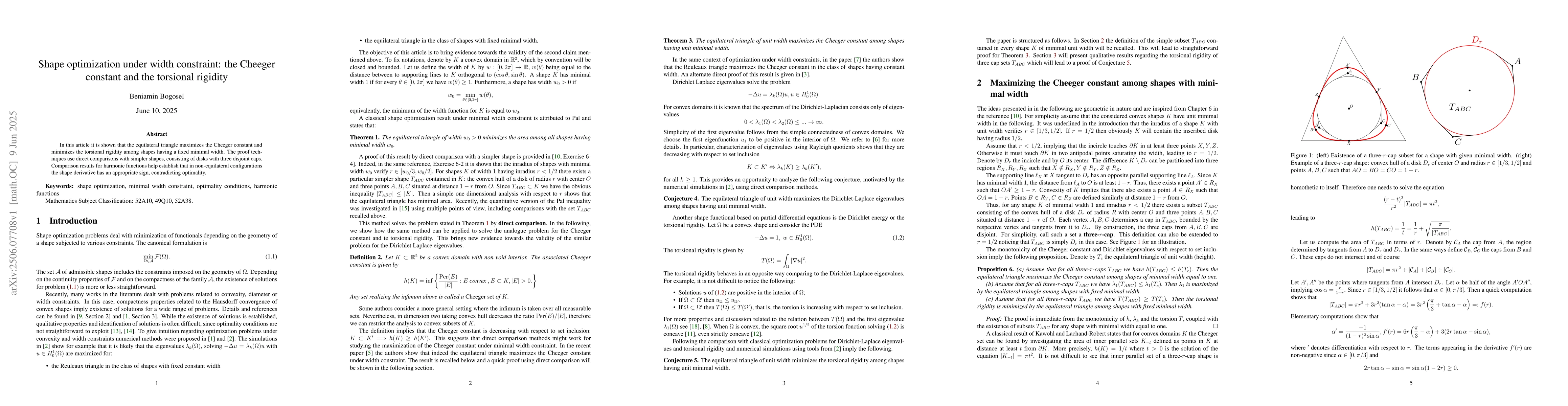 In this article it is shown that the equilateral triangle maximizes the Cheeger constant and minimizes the torsional rigidity among shapes having a fixed minimal width. The proof techniques use direct comparisons with simpler shapes, consisting of disks with three disjoint caps. Comparison results for harmonic functions help establish that in non-equilateral configurations the shape derivative has an appropriate sign, contradicting optimality.